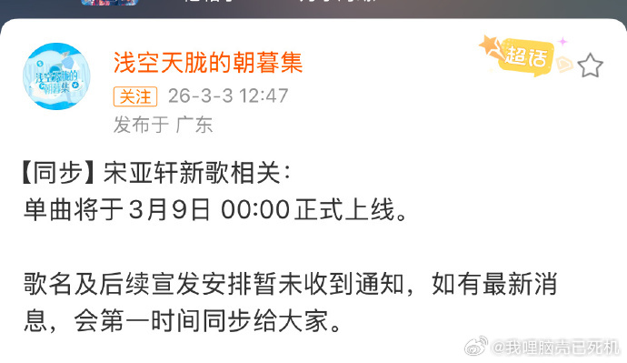 宋亚轩新歌信息宋亚轩新歌3月9日将上线 宋亚轩新歌相信息有,宋亚轩新歌3月9日将上线,期待住小宋的新歌见面啦~