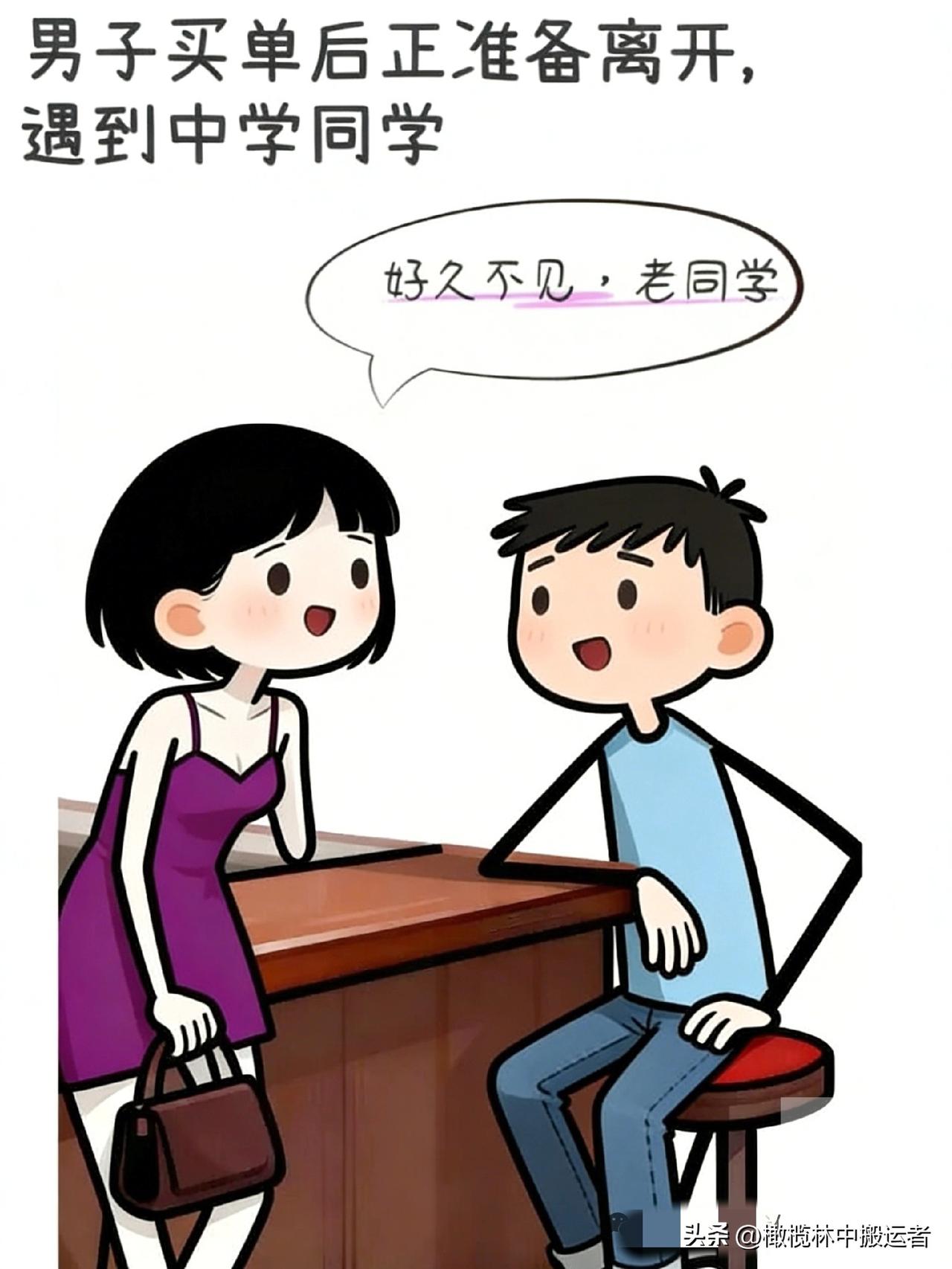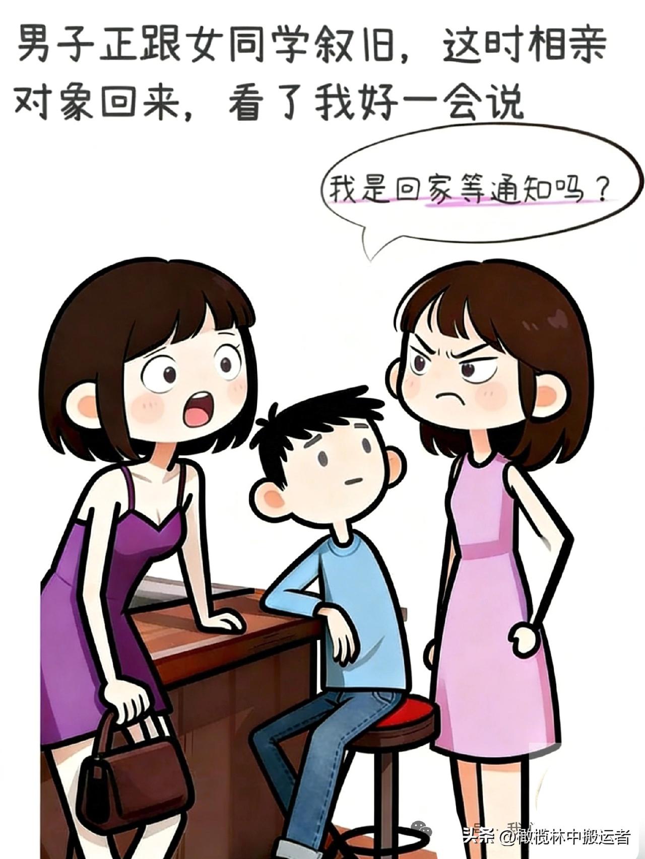 趣味漫画:两人相亲!女子去洗手间,男子等了很久不见女子回来,准备离开时遇到女同学与其叙旧,相亲对象回来看到了说:我是回家等通知吗