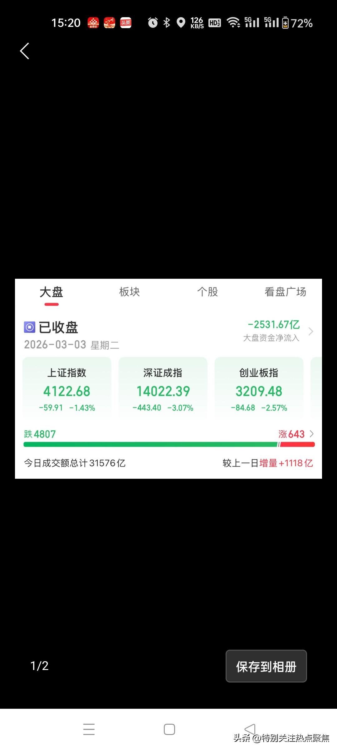 2026年3月3日这股市,简直惨不忍睹!收盘时上证大跌1.43%,深证大跌3.07%,创业板大跌2.57%。上涨的仅有643家,下跌的多达4807只,这比例太吓人了。 行业板块普跌,稀土、军工等跌幅居前,只有石油石化、航运港口等少数板块逆市走强。资金都跑去油气板块抱团了。 战争带来的危机让全世界恐惧,股市也跟着遭殃。真心呼唤世界和平,没了战火,股市说不定也能好起来。