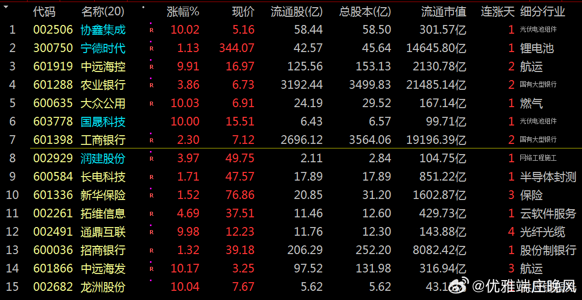 今日市场:市场整体:个股普涨:协鑫集成、宁德时代、中远海控、农业银行等个股逆势大涨,核心驱动:因素为国家新一轮消费补贴政策全面落地,尤其聚焦新能源汽车领域。今日透析:持续政策和因素刺激: