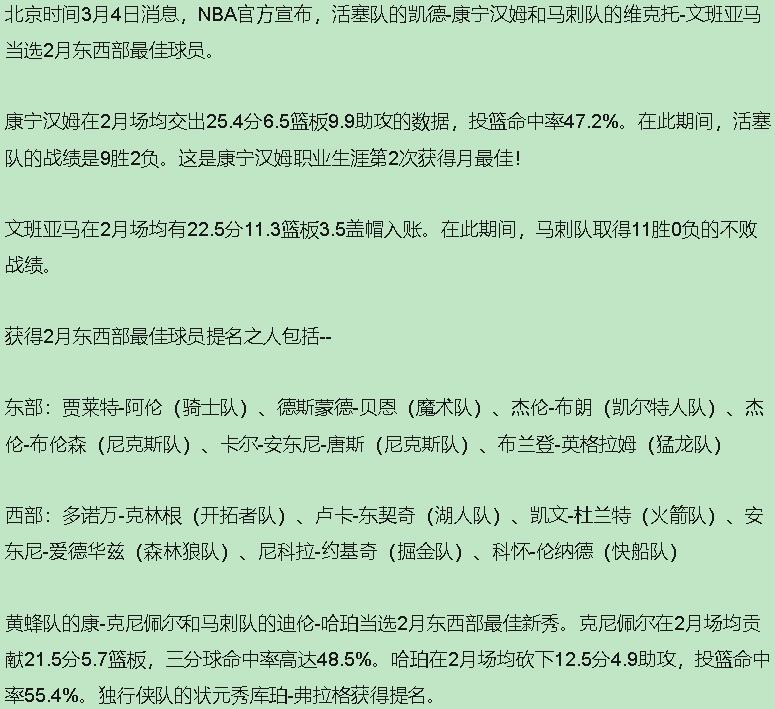 还以为是联盟硬捧?看完录像我直接闭嘴。马刺这次横扫月奖,真没偷没抢。 文班亚马那3.5个盖帽,根本不是刷的。你看他打国王,小萨刚进禁区抬手就要吃瘪;对阵湖人,浓眉背顶三秒愣是没找着筐。这种威慑力,数据栏装不下。11连胜期间,马刺防守效率冲到西部第一。你说赛程简单?爵士黄蜂也是NBA球队,换别的队来,能啃得这么干净?约基奇数据炸裂,可掘金在输球;文班带着球队在赢球,这才是差距。 坎宁安那边就尴尬了。25+10的数据漂亮,打雄鹿那场我亲眼见的,21中7,关键时刻隐身。活塞9胜2负,赢的都是谁?开拓者、黄蜂、爵士,摆烂兄弟聚会。输雄鹿21分,被绿军吊打。这种"虐菜稳如狗,遇强就拉胯"的表现拿月最佳,布伦森带伤血C却落选,联盟这碗水,端得有点歪。 哈珀和约翰逊呢?一个把球喂得舒服,一个把毛坯房装成了精装。马刺这次不是分猪肉,是团队进化的军功章。 篮球终究看输赢。文班在用防守改写比赛逻辑,坎宁安还在刷数据找存在感。下个月碰强队,坎宁安要是还软,这奖就是黑历史;文班只要继续站那儿,就是禁飞区本身。时间会拆穿一切。康宁汉姆文班亚马当选2月最佳球员 马刺包揽4大奖项