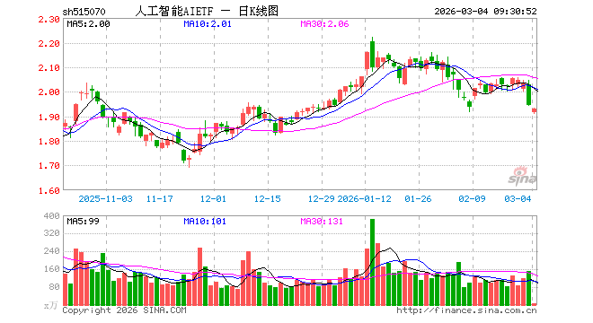 3月4日,人工智能AIETF(515070)开盘跌1.49%,报1.917元。人工智能AIETF(515070)重仓股方面,中际旭创开盘跌1.73%,新易盛跌1.20%,寒武纪跌0.98%,澜起科技跌0.60%,中科曙光跌2.74%,科大讯飞跌1.32%,海康威视跌0.92%,豪威集团跌1.16%,金山办公跌0.97%,浪潮信息跌1.41%。