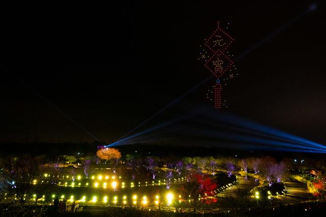 无人机编队如流萤般闪烁变幻,在深邃夜空中依次排列出“元宵节快乐”“团团圆圆”等字样,将传统佳节的美好祝福洒向游客心田。随后,编队迅速重组,灵动勾勒出打鼓、松鼠等栩栩如生的造型,鼓点仿佛在云端敲响,松鼠跃然天际,引得现场阵阵惊叹。“太震撼了!没想到来赏花还能邂逅无人机表演,每一秒都不想错过。”游客张先生举着手机连连拍摄,记录下难忘瞬间。