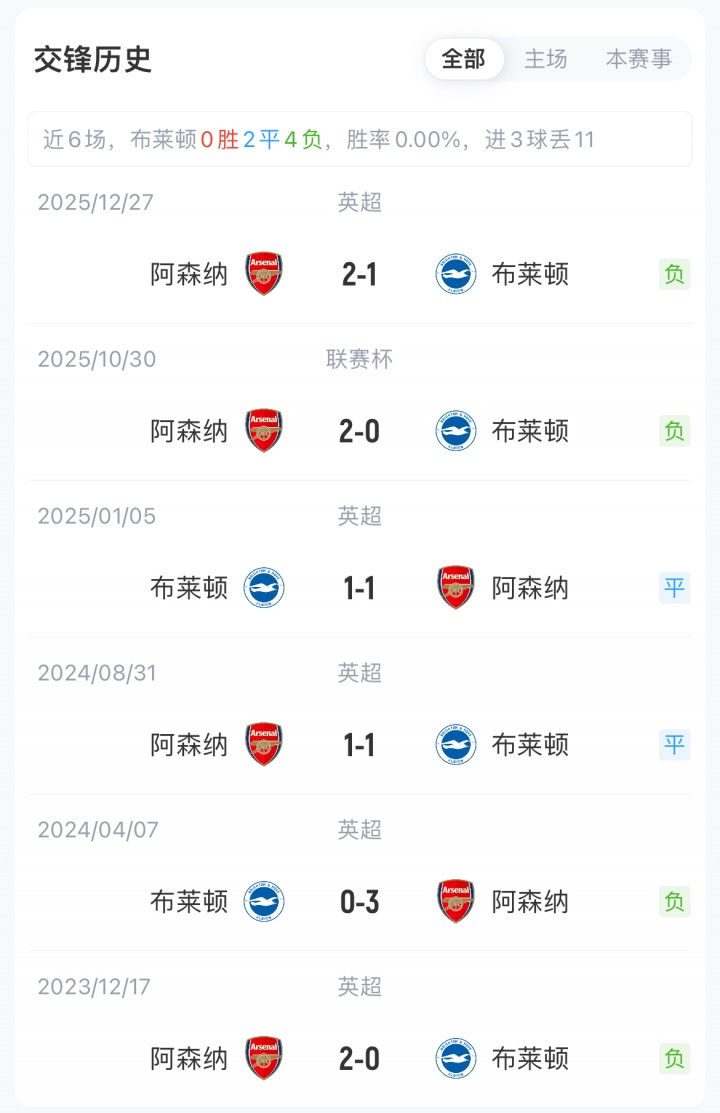 阿森纳联赛19胜7平3负积64分位居英超榜首,各项赛事已连续9场不败;布莱顿联赛9胜10平9负积37分暂位英超第12,目前已获两连胜。阿森纳对阵布莱顿已连续6场不败(4胜3平)。