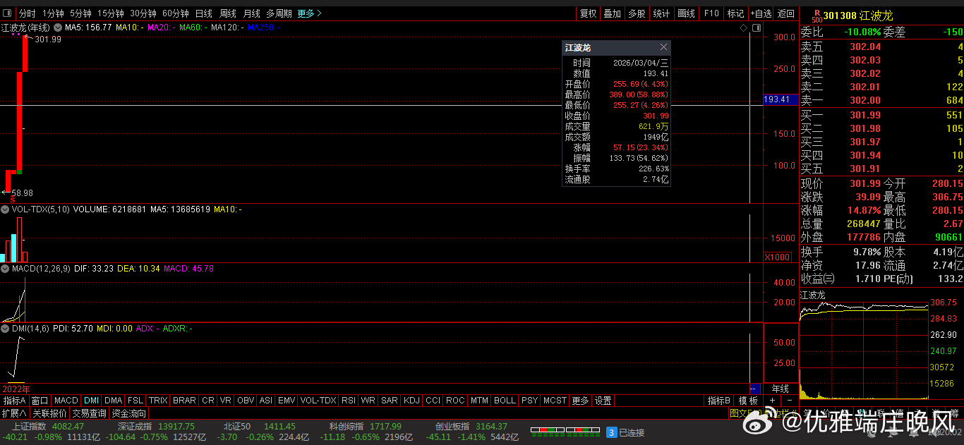 收盘价: 301.99 元。涨跌幅:14.87%。净流入: 4.96亿