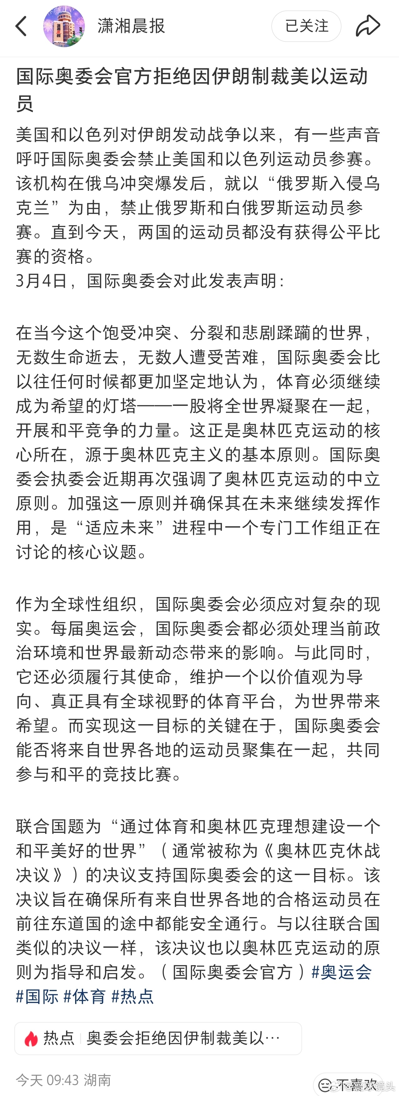 国际奥委会官方拒绝因伊朗制裁美以运动员国际奥委会重申奥林匹克运动的中立原则,呼吁成员国支持运动员参赛,强调体育凝聚和平力量。