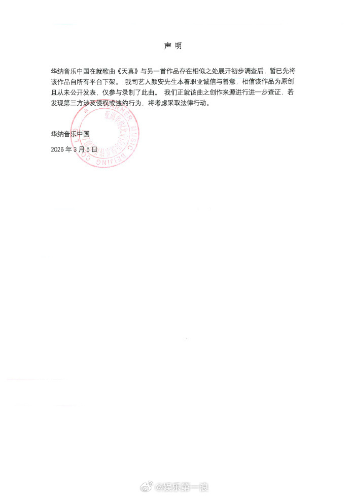 颜安方下架歌曲天真颜安公司声明 刚刚,发布声明,称在核查中发现艺人演唱的歌曲《天真》与已上架作品存在内容相似的情况,目前已启动调查程序。声明中还强调,颜安仅接受华纳音乐中国的邀请进行该歌曲的音乐录制,全程未参与任何版权采购环节。颜安高度重视原创保护及著作权合规,在最终调查结论出具前,已第一时间要求华纳音乐中国对该歌曲作全平台暂时下架处理。