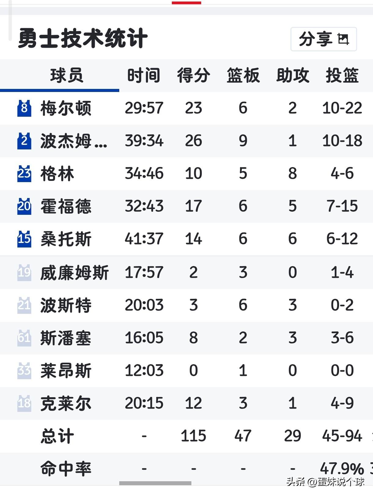 今天NBA比赛再次爆出“大冷门”,“老弱残兵”的勇士战胜了本赛季夺冠大热门火箭队,你看下有多“冷门”: 第一、勇士缺少了巴特勒跟库里二位超级明星,首发有一个快40岁的霍福德,还有一个发展联盟水平的桑托斯。 第二、反观火箭队,坐拥NBA历史上最好的射手杜兰特,全明星级别球员申京,再次拿下历史新高的未来明星谢泼德,还有天赋满满的阿门。 这悬殊的阵容对比,没想到勇士居然赢了,也许库里说的对,如果勇士进了季后赛,那将是所有季后赛球队都不得不害怕的球队,对此,你怎么看。