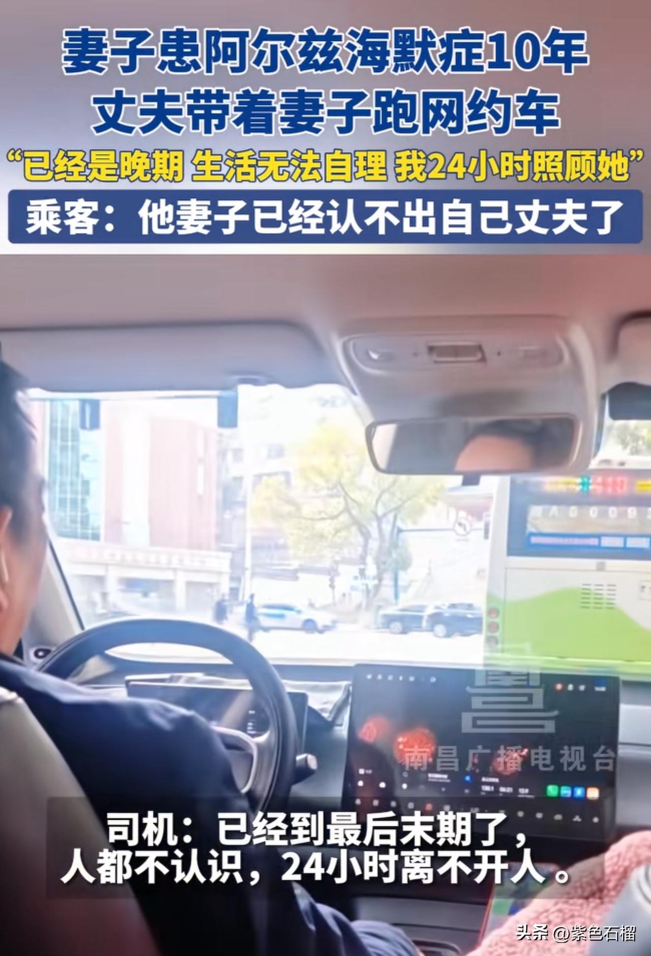 看得人泪目了!妻子患阿尔茨海默症10年,丈夫坚持带妻跑网约车:你忘了全世界,我做你的全世界。 十年不离不弃,一辆车就是一个家,这个故事看哭无数人! 近日在湖南长沙,有这样一位网约车司机,他的事迹感动了整座城市。他的妻子已经被阿尔茨海默症折磨了整整10年,如今已经到了中晚期,病情越来越重,生活基本无法自理。 而他的子女都不在身边,没人帮忙照顾,深思熟虑之下他做了一个决定:那就是走到哪,就把妻子带到哪。 从此,他的网约车副驾,永远只属于妻子一个人。跑车赚钱,是为了养家;而寸步不离,是为了能守护她。 为了能获得乘客的理解,他特地在车上贴着一张字条,字条上解释了为什么副驾驶座有人的原因,让人看了温柔又心酸: 妻子患病,需随身携带,望各位乘客理解。还可以为乘客提供充电服务。 没有卖惨,没有抱怨,只有一个男人最朴素的担当。 他每天出车十多个小时,他一边接单,一边照看妻子。妻子渴了他递水,妻子困了她安抚,把妻子当做孩子一样照顾着。 别人的车是赚钱工具,他的车,却成了两个人移动的家。 有人问他,你累不累?他淡淡地回答:她在,家就在。 你忘了全世界,没关系。我记得你,我陪着你,我做你的全世界。 这不是轰轰烈烈的爱情,却是普通人最长久、最踏实的深情。 十年相守,不离不弃。愿岁月温柔善待这对平凡又伟大的夫妻。 对此,大家有什么想说的?欢迎评论区聊聊。 (图片来源网络)