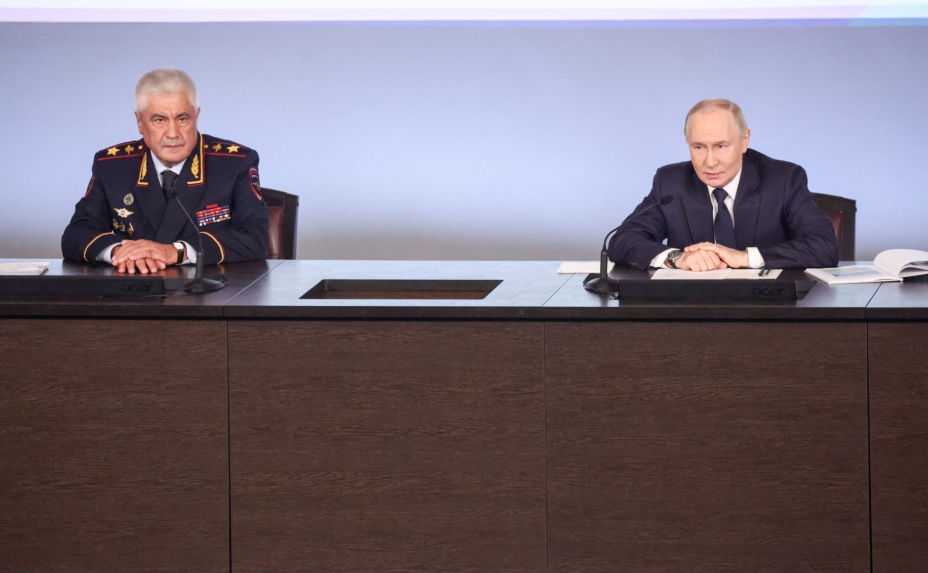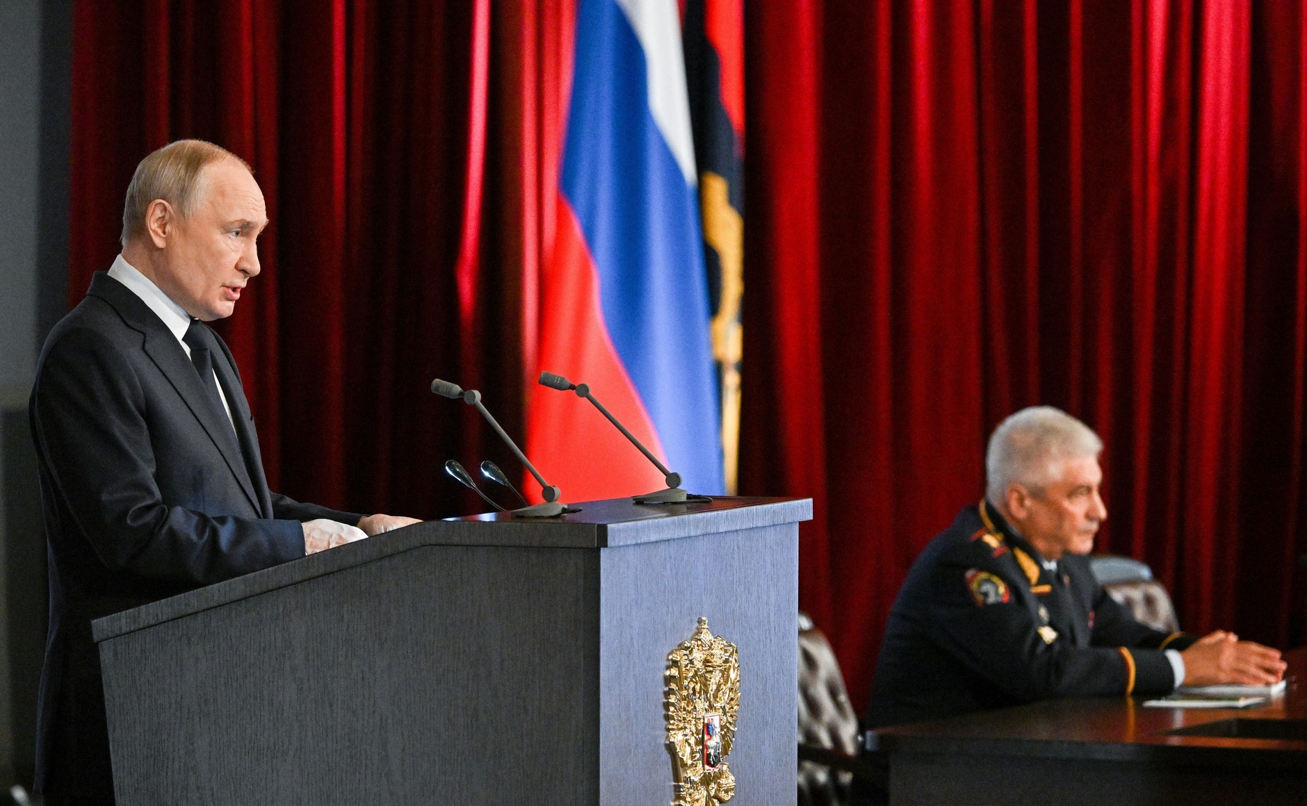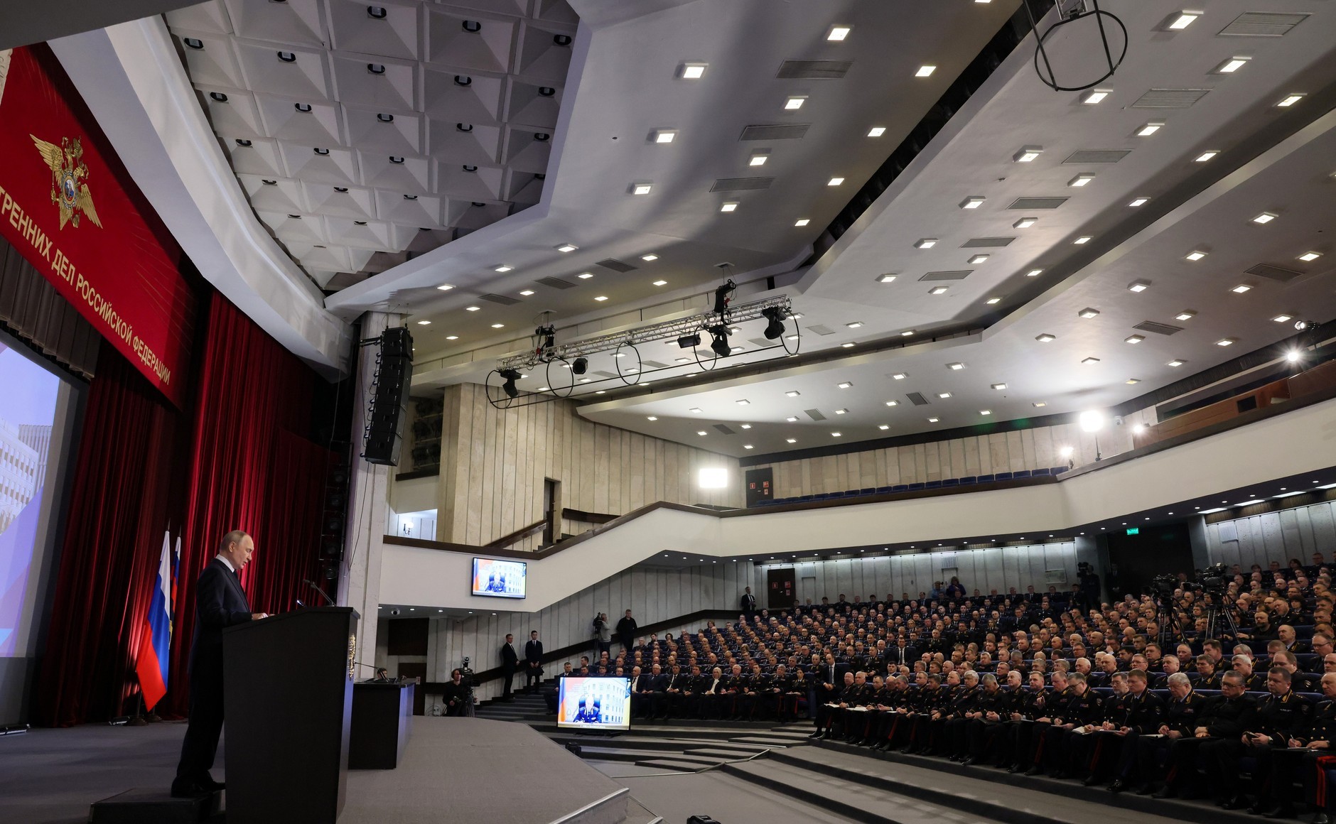 弗拉基米尔·普京在俄罗斯内务部年度扩大会议上发表讲话。
