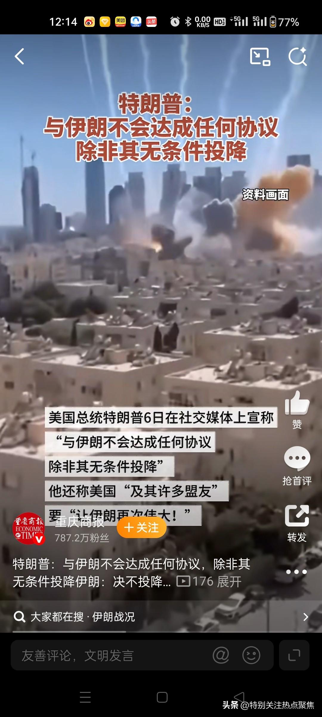 特朗普:除非伊朗无条件投降,否则不会达成任何协议,还喊出“让伊朗再次伟大”。 当地时间3月6日,特朗普在社交媒体表态,除非伊朗无条件投降,否则不会达成任何协议,并且喊出“让伊朗再次伟大”。 白宫同日宣称,美方正稳步推进控制伊朗领空,预计4 - 6周内达成目标。 伊朗方面明确回应,决不投降,将继续抵抗,同时呼吁国际调解应针对冲突挑起者。 当地时间3月6日,特朗普与白宫同步向伊朗发出极具争议的“无条件投降”通牒,而伊朗强硬表态“决不屈服”,双方立场完全对立,中东局势一触即发。 一、美方立场:以“无条件投降”为唯一前提 特朗普强硬表态 3月6日,特朗普通过社交媒体宣称,美国不会与伊朗达成任何协议,除非伊朗“无条件投降”。他同时使用争议性口号“让伊朗再次伟大!”(Make Iran Great Again),并暗示美国及其盟友将主导伊朗的未来走向。@CCTV国际...47 白宫诠释“投降”实质 白宫新闻秘书莱维特在当天的发布会上解释,“无条件投降”指美方单方面认定伊朗不再构成威胁、且军事目标全部实现的状态,无论伊朗是否公开承认。白宫同步宣称,美军正稳步推进控制伊朗领空的进程,预计4至6周内完成目标。1CCTV国际时讯CCTV4重庆商报 二、伊朗回应:誓死抵抗,拒绝谈判 官方强硬拒降 伊朗驻俄罗斯大使及高层官员明确表态“决不投降”,强调将继续抵抗美以侵略。伊朗外长阿拉格齐更驳斥特朗普“参与挑选伊朗领导人”的言论,称“这是伊朗人民的事,不容干涉”。@重庆商报811 军事防御升级 伊朗已公开表示做好迎击美军地面入侵的准备,并拒绝美方一切谈判提议。阿拉格齐强调“不停火、不谈判”立场,称伊朗将不惜代价自卫。@观察者网911观察者网 三、冲突背景与区域联动 军事行动持续升级 此次通牒发生于2月底美军空袭导致伊朗最高领袖哈梅内伊身亡后。3月1日,特朗普曾威胁“伊军不投降必死无疑”,3月6日以色列同步摧毁哈梅内伊在德黑兰的应急指挥地堡及导弹设施,进一步削弱伊朗指挥能力。@CCTV4614 美以战略协调 2月11日特朗普与以色列总理内塔尼亚胡闭门会晤,双方约定“密切协调”。以方要求任何协议需确保伊朗永不拥核,而特朗普暗示若谈判失败将派遣第二航母群备战。@央视新闻新浪热点央视新闻 四、国际调解与风险预警 伊朗呼吁国际调解应针对“冲突挑起者”,直指美以责任。中国外交部此前对美方“投降论”表示严重关切,反对违反联合国宪章的胁迫行为,呼吁有特殊影响力的国家承担缓和局势责任。@环球网 当前形势已形成“美伊零和博弈”死局:美方将军事目标等同于伊朗“事实投降”,而伊朗视妥协为亡国屈辱,双方回旋余地几近消失,地区全面冲突风险持续攀升。147美国对伊朗开战 美国要打伊朗 伊朗怒批美国 美国入侵伊朗 伊朗硬不起来了 伊朗外交大转向 伊朗怒怼美国