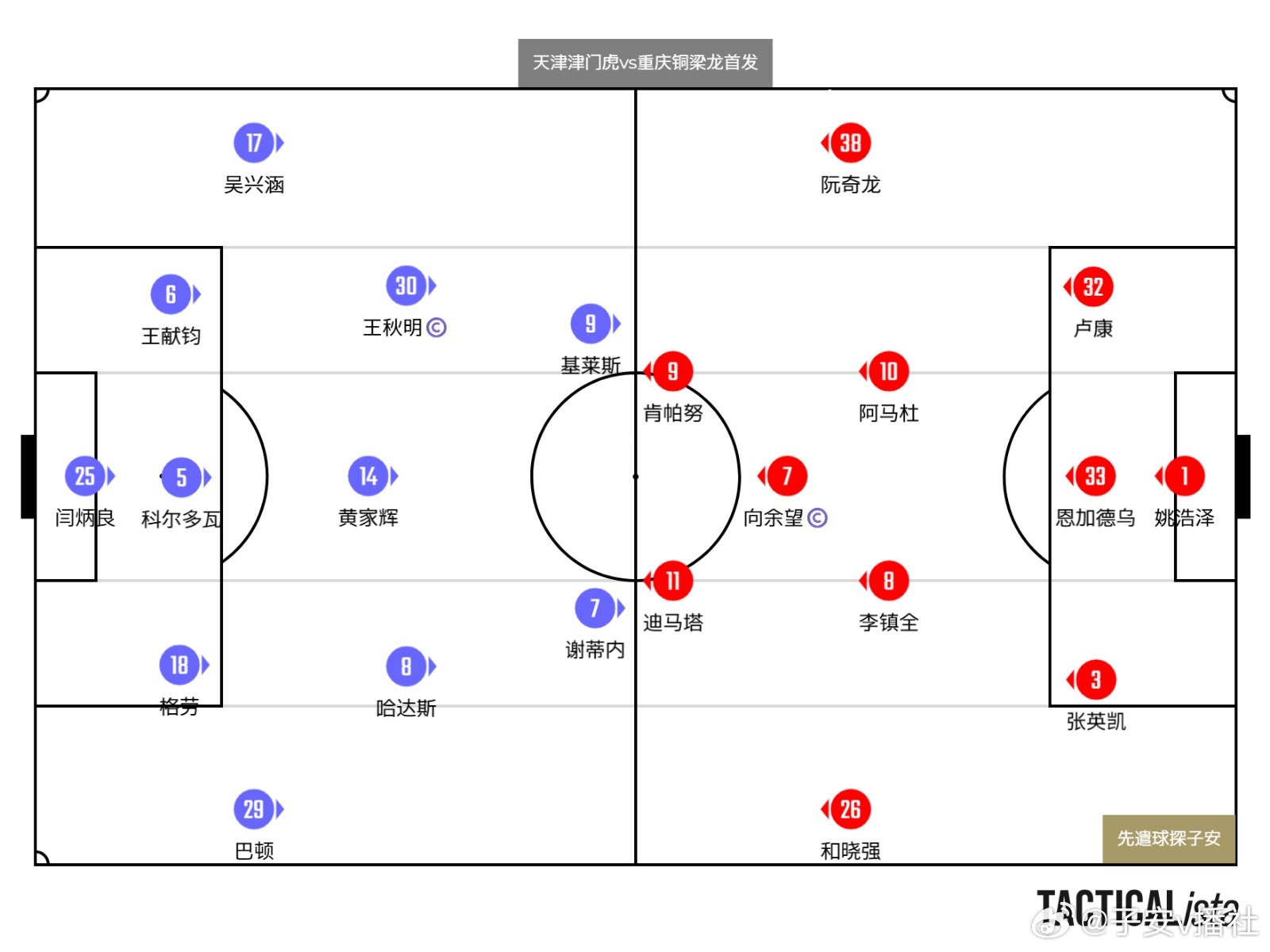先遣球探子安,评估球员位置属性,解析比赛进程。2026赛季中超第一轮,天津津门虎vs重庆铜梁龙🏟️双方首发阵容天津:5-3-2阵型(图1)重庆:5-4-1阵型(图2)