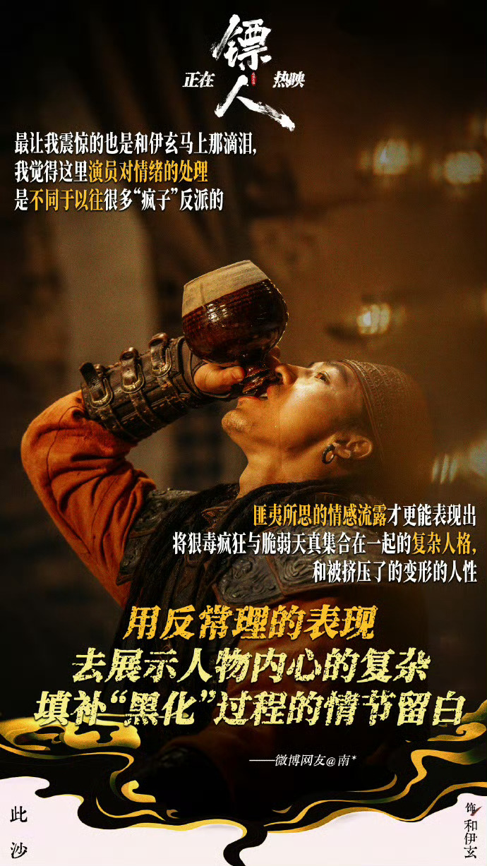 此沙镖人口碑 此沙演绎的和伊玄坏得彻底又极具魅力,反派形象立体鲜活,眼神与气场全