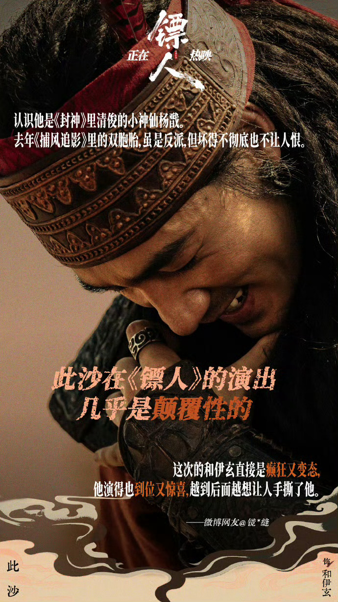 此沙镖人口碑 此沙演绎的和伊玄坏得彻底又极具魅力,反派形象立体鲜活,眼神与气场全程在线,台词口音处理细腻到位。凭扎实演技为角色赋予独特张力,难怪好评不断,真的把这个角色演活了!