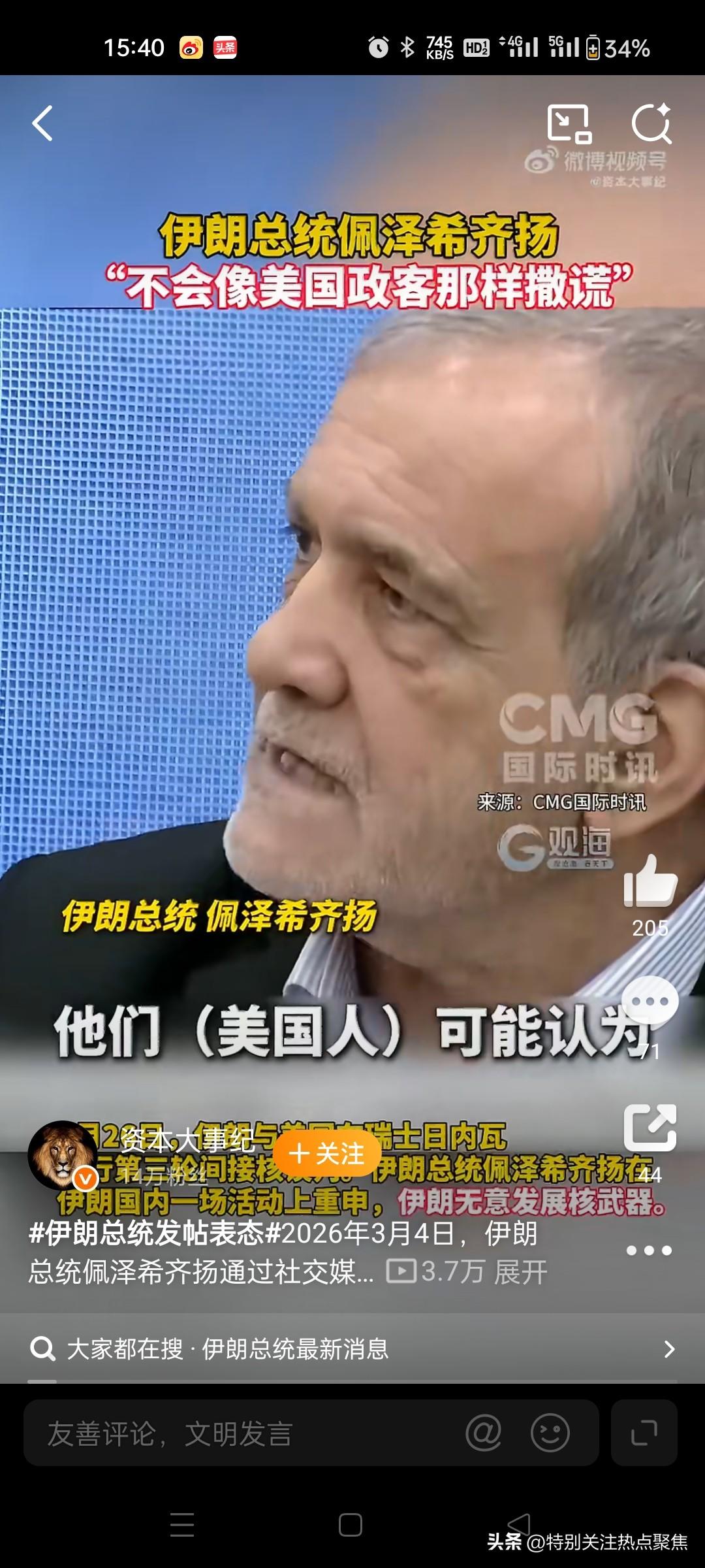 伊朗总统向攻击邻国道歉!就地区冲突向邻国正式道歉,并宣布临时领导委员会决议暂停对邻国的主动攻击,但保留自卫反击权,承诺“不再攻击邻国,也不发射导弹”,但强调若邻国首先发动攻击,伊朗将保留反击权利。他特别向邻国致歉,称此前冲突是“被迫自卫”,并重申尊重各国主权。 伊朗总统佩泽希齐扬于2026年3月7日发表全国讲话,首次就地区冲突向邻国正式道歉,并宣布临时领导委员会决议暂停对邻国的主动攻击,但保留自卫反击权,此举被视为伊朗缓和地区紧张局势的关键转折点。@财联社APP417 一、核心决策内容与背景 关键表态:佩泽希齐扬在讲话中明确表示,伊朗临时领导委员会于3月6日通过决议,承诺“不再攻击邻国,也不发射导弹”,但强调若邻国首先发动攻击,伊朗将保留反击权利。他特别向邻国致歉,称此前冲突是“被迫自卫”,并重申尊重各国主权。@闲云战鹤317 决策机构合法性:临时领导委员会成立于3月1日伊朗最高领袖哈梅内伊遇袭身亡后,由总统、司法总监及宗教法学家组成,代行最高领袖职权直至新领袖选出。该委员会此前已召开四次会议,统筹军事与外交应对策略。@环球时报1113 表态背景:此前美以联合军事行动导致伊朗高层遇袭、民用设施损毁及平民伤亡(如米纳卜市小学遇袭致115人死亡),伊朗发起代号“真实承诺”的报复。佩泽希齐扬3月4日曾以阿拉伯语和波斯语双语发帖,呼吁地区国家共同维护安全,反对外部干预,为此次道歉埋下伏笔。1922资本大事纪 二、战略意图与多方解读 避免多线作战:分析指出,伊朗意在安抚阿拉伯邻国(如沙特、阿联酋),防止其倒向美以阵营,集中力量应对美以威胁。例如阿联酋在伊朗表态后暂停所有迪拜航班,反映地区国家高度戒备。3512 权力结构矛盾:部分观察认为总统表态效力存疑。用户@吕杨先生指出,伊朗革命卫队仍持续行动(如3月7日打击伊拉克库区目标及霍尔木兹海峡油轮),实际军事决策可能独立于政府。@吕杨先生326 外交博弈空间:佩泽希齐扬同日称“绝不可能无条件投降”,并呼吁国际调解“针对冲突挑起者”(暗指美以),试图将地区矛盾转向外部势力。中方、俄罗斯等多国呼吁停火,支持政治解决危机。@西海龙王IV13偲赋 三、关联行动与地区影响 军事行动未完全停止:尽管承诺不主动攻击邻国,伊朗3月7日仍以“自卫”名义实施两项行动: 导弹打击伊拉克库尔德自治区三处“分裂组织驻地”,警告其不得危害伊朗领土。3 击伤“强行进入霍尔木兹海峡”的商用油轮“普里马号”,加剧航运风险。3 地缘连锁反应:印度接纳伊朗军舰“拉万”号停靠科钦港,斯里兰卡转移另一伊朗舰船船员,显示地区国家在美伊对峙中寻求中立。3 全球能源担忧:霍尔木兹海峡冲突与阿联酋停飞事件,加剧国际社会对全球能源供应中断的忧虑。39 四、专家视角:双轨策略的困境 缓和表象下的矛盾:佩泽希齐扬试图通过道歉争取外交空间,但革命卫队的行动凸显伊朗“政府温和表态+军队强硬反击”的双轨模式。这种矛盾可能导致邻国对其承诺持观望态度。@马延明429 美以反应待观察:美以尚未回应伊朗最新表态。此前特朗普威胁“有限军事打击”逼伊朗妥协,以色列则持续空袭伊朗目标,局势仍有升级风险。@羊城晚报38 总结:伊朗此次道歉与暂停攻击承诺,是临时领导委员会危机管控的关键举措,旨在孤立美以、降低地区冲突外溢风险。然而军事与外交的脱节,以及美以后续行动,将决定这一策略能否真正为局势降温。91232天岗268