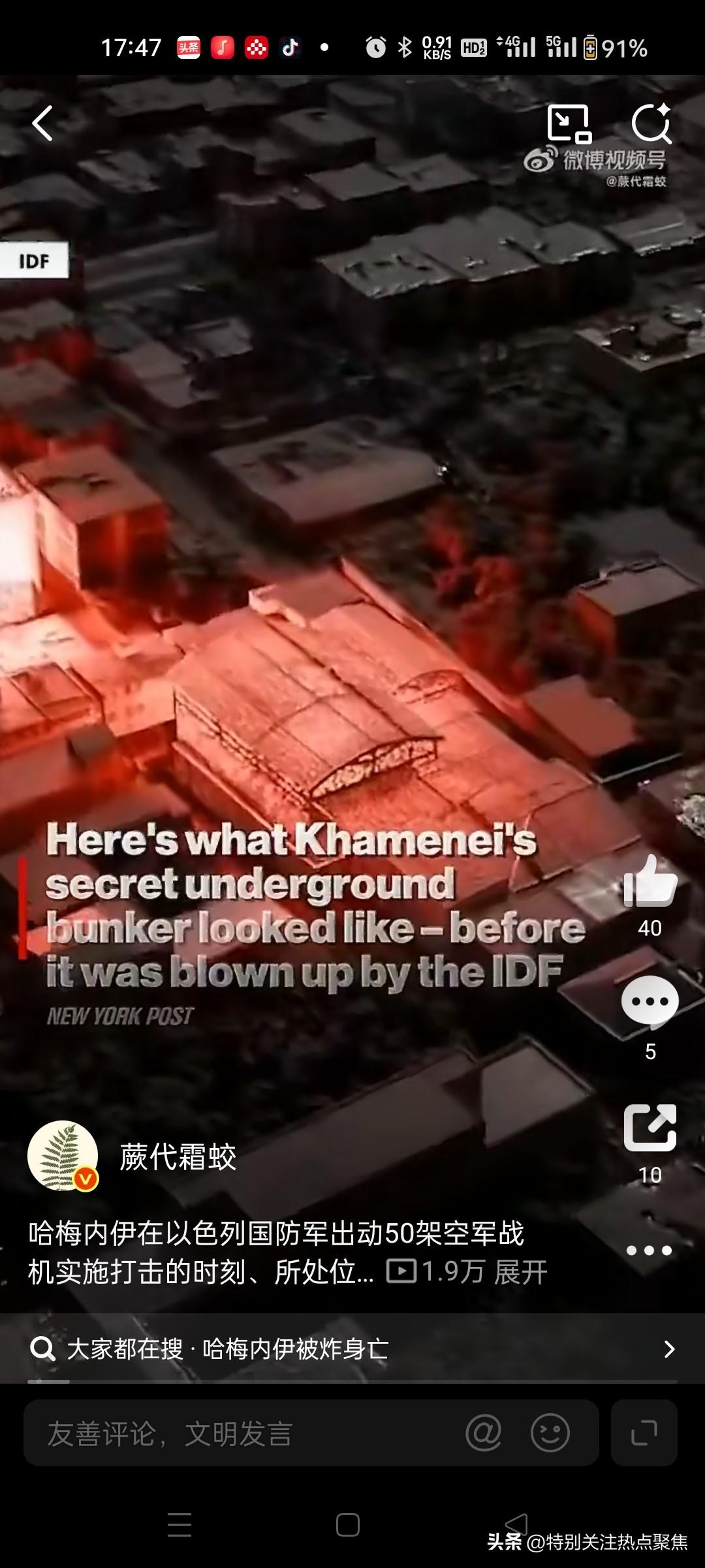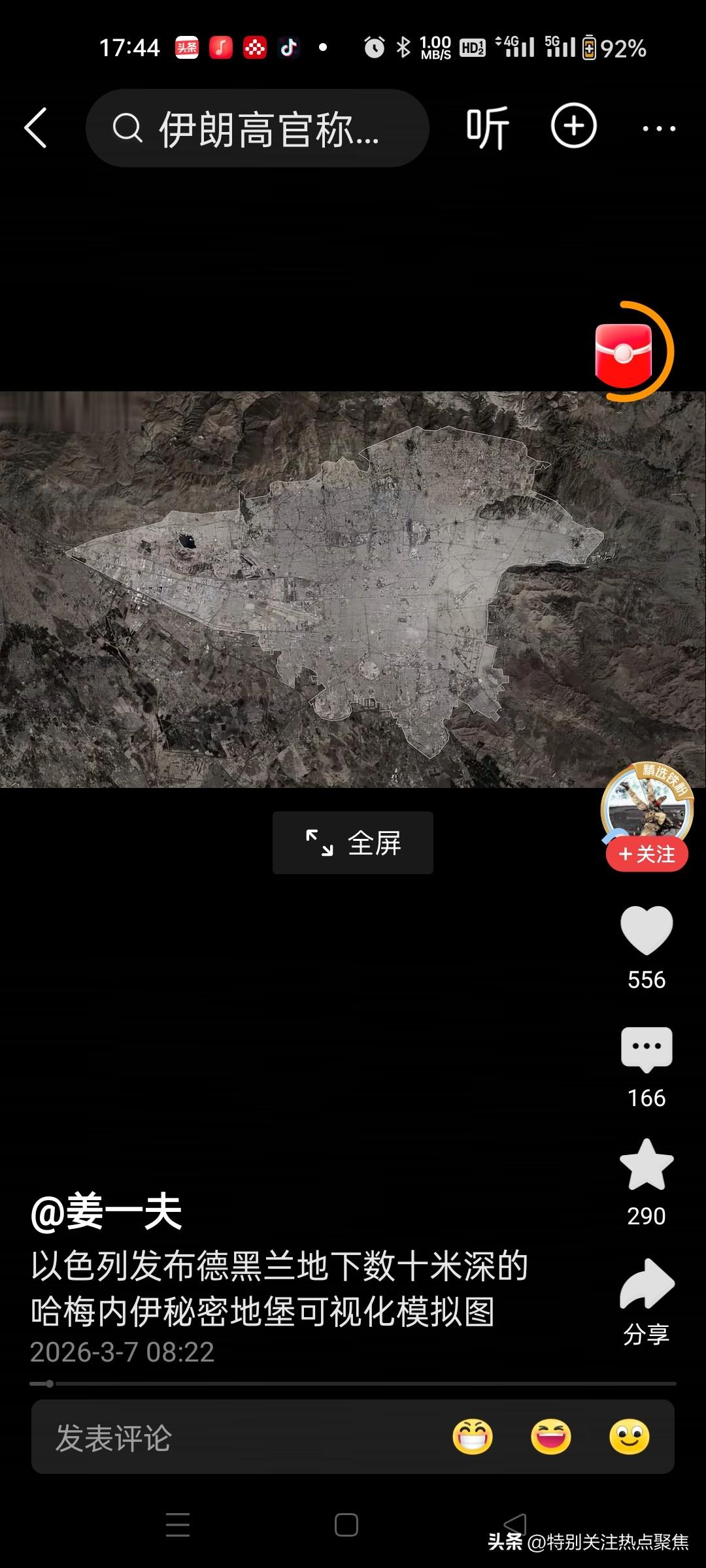 以色列公布哈梅内伊地下数十米深秘密地堡被炸毁后的结构可视图 2026年3月6日,以色列军方公布了一段3D可视化视频,详细呈现了伊朗已故最高领袖哈梅内伊位于德黑兰市中心地下数十米深的秘密地堡结构。该地堡在2月28日哈梅内伊遇袭身亡后,被以军摧毁。@参考消息511参考消息CCTV国际时讯头条新闻 地堡结构与功能细节 深层复合体设计: 该地堡位于德黑兰“领导层建筑群”正下方,横跨多条街道,深度达数十米。内部为多层架构,顶层是指挥中心,中层为生活区,底层是加固的“安全屋”。以色列发布的3D模型显示,地堡包含多个入口、隧道网络以及专用会议室,供伊朗高层官员战时使用。@中孚贞明1111 防护与造价争议: 地堡采用超高性能混凝土建造,理论上可抵御重型钻地弹。但以军事后披露的情报显示,摩萨德已掌握其内部细节(包括墙上海报等),暗示情报渗透之深。部分分析认为,此类掩体建造耗资巨大,实际防御效果却存疑。@杨帆教授114中孚贞明1 情报获取与打击行动 监控系统入侵: 以色列情报机构“8200部队”及摩萨德通过黑客手段,长期掌控德黑兰几乎所有道路摄像头。重点监控哈梅内伊官邸附近的巴斯德大街,追踪保镖及司机的通勤路线、停车位置和值班规律,构建AI行为模型。@中国新闻周刊2035 精准打击过程: 时机选择:2月28日上午,以情报部门通过摄像头及内线确认哈梅内伊离开地堡参加高层会议,行动前干扰周边十余座手机基站,阻断预警通讯。@极目新闻615 战术执行:以军出动50架战机(F - 35与F - 16协同),在数百公里外发射30余枚空射弹道导弹(如“金色地平线”型号),穿透地表命中目标。@战刀0072432齐都督中国新闻周刊头条新闻极目新闻 行动影响与国际反应 战略目标达成: 以色列宣称摧毁该地堡是为瘫痪伊朗“核心军事指挥枢纽”,削弱其报复性反击的协调能力。但伊朗媒体称袭击仅造成建筑群损毁,未提及关键人员伤亡。121618 人道危机升级: 美以持续空袭导致德黑兰平民设施受损,1332名伊朗平民死亡(含165名儿童)。联合国警告中东难民已达2500万人,冲突外溢风险加剧。2345 关键争议点: 伊朗掩体实际损毁程度尚无独立核实,而以色列情报透明度被质疑含有信息战成分。@海上月82318大胖也许不胖