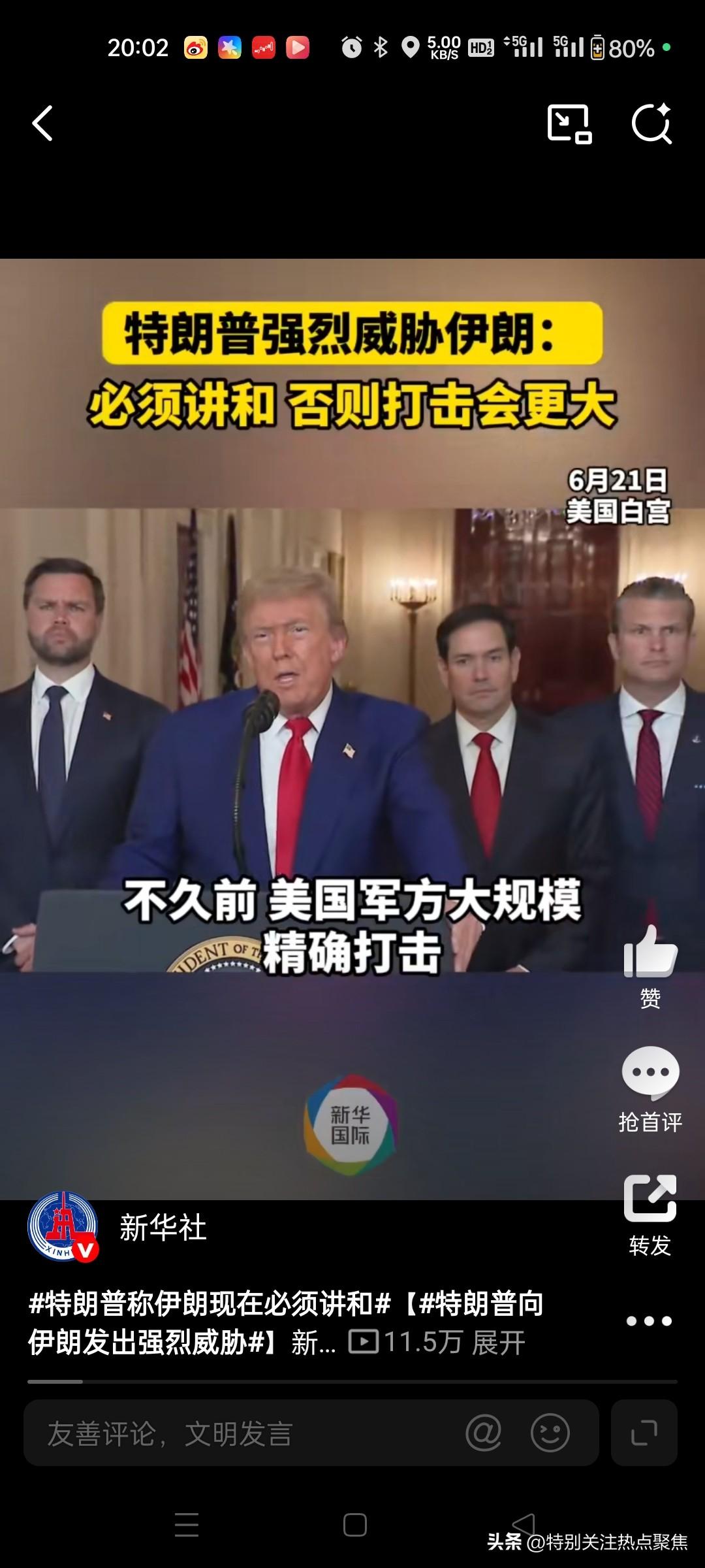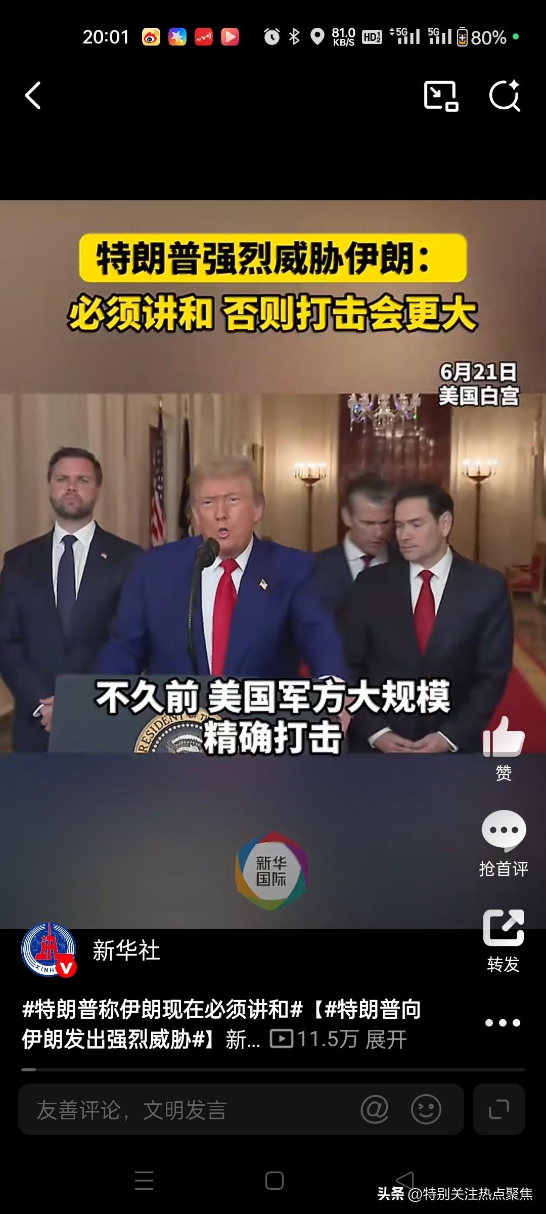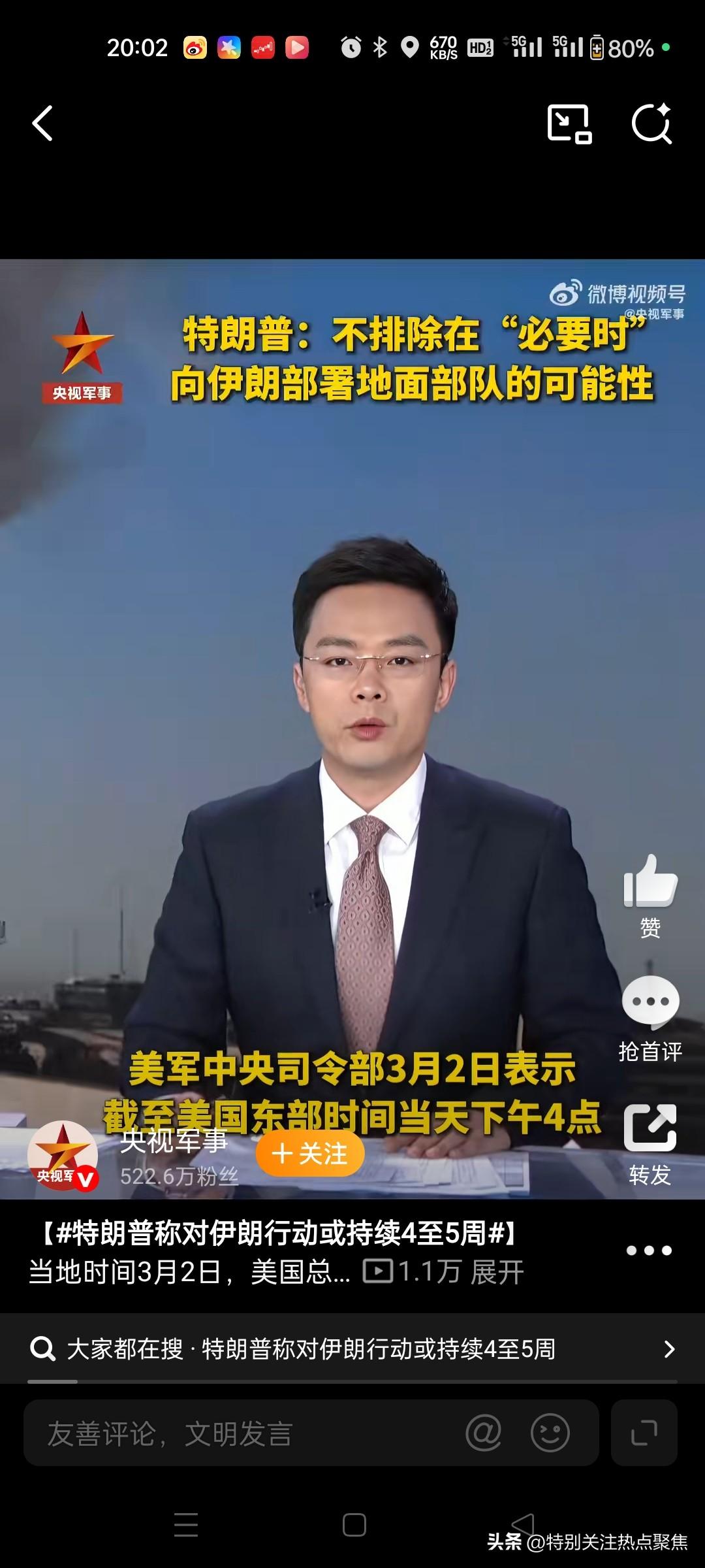 特朗普又发狠宣称考虑扩大打击范围 伊朗或遭受“非常沉重打击”你信不信? 当地时间3月7日,美国总统特朗普通过社交媒体声明,因伊朗的行为,美方正“严肃考虑”扩大军事打击范围,包括此前未列为目标的地区和人群,并警告伊朗可能遭受“非常沉重的打击”,引发对冲突升级的广泛担忧。 一、美伊冲突最新动态与军事行动目标 扩大打击范围的威胁 特朗普在3月7日的声明中明确表示,美国可能将此前未涉及的特定地区和人群纳入军事打击范围,理由是伊朗“持续威胁行为”。此举被分析视为冲突进一步升级的信号。 军事行动的持续与目标调整 美国自2月28日联合以色列发动军事行动以来,宣称核心目标为:@新华社10 摧毁伊朗导弹能力与海军力量(已公开称击沉10艘伊朗舰艇);@央视军事13 确保伊朗无法获得核武器; 切断伊朗对境外武装组织的支持。 特朗普3月2日曾表示行动原计划持续4至5周,但已准备“远超这一期限”,暗示长期作战可能性。@参考消息11新华社CCTV国际时讯央视军事参考消息 二、美方策略矛盾性与伊朗应对 地面部队部署的反复表态 3月3日,特朗普暗示不排除向伊朗派遣地面部队,声称“对部署毫无畏惧”,打破历任总统回避地面战的惯例;1 3月6日,特朗普改口称当前阶段未考虑派遣地面部队,理由是“浪费时间”,并宣称伊朗“已失去海军和一切”。伊朗外长阿拉格齐随即回应称“已准备好应对地面入侵,等待美军带来大灾难”。@北京日报 伊朗的强硬反制警告 面对美国威胁,伊朗多次警告将进行“前所未有”的反击。3月1日,特朗普曾公开要求伊朗不得报复,否则美方将以“更大武力回击”。@大众新闻-大... 三、舆论对特朗普决策的质疑 根据近期社交媒体观点汇总,美国内外对特朗普行动的主要批评包括: 行动鲁莽性:28.3%的声量批评其未经国会授权扩大打击,可能破坏国际稳定并引发更大冲突; 决策混乱性:13.3%的声量指出其政策反复(如地面部队表态矛盾)、夸大军事成果(如自称“彻底清除”核设施),损害美国信誉;7 干涉内政争议:7.0%的声量谴责其企图为伊朗“选定领导人”等言论,违反国际法准则。12新华社 四、冲突长期化风险 当前局势显示美伊均无让步迹象: 美国坚持要求伊朗“无条件投降”并放弃核能力;@人民日报9 伊朗认定美以策划颠覆其政权,号召民众“挫败敌人阴谋”。若双方持续强硬对抗,地区冲突范围与平民安全风险恐进一步升高。@中国新闻网人民日报大皖新闻中国新闻网 美国对伊朗开战 美国要打伊朗 伊朗怒批美国 美国入侵伊朗 伊朗饱和打击 伊朗硬不起来了 伊朗外交大转向