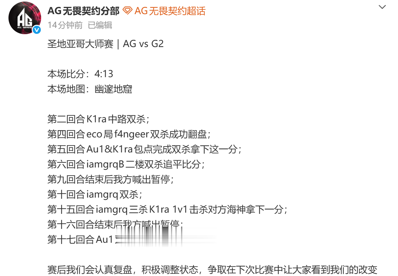 虎扑03月08日讯2026圣地亚哥大师赛淘汰赛,AG0-2不敌G2,赛后AG发文:
