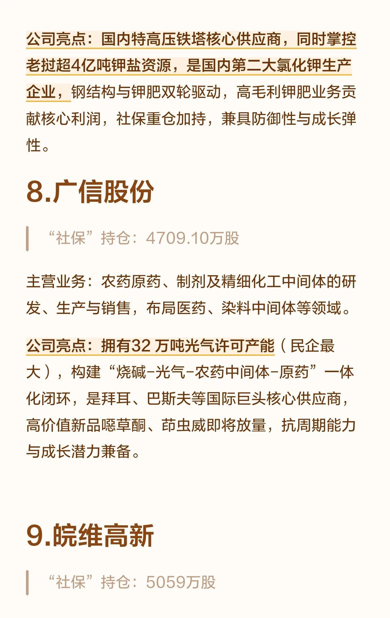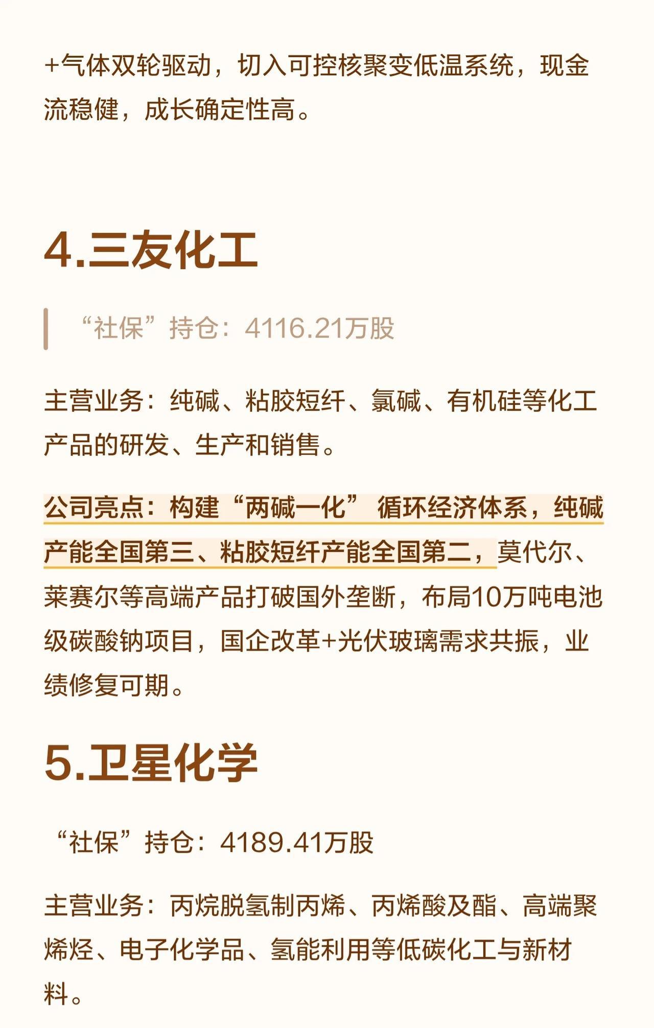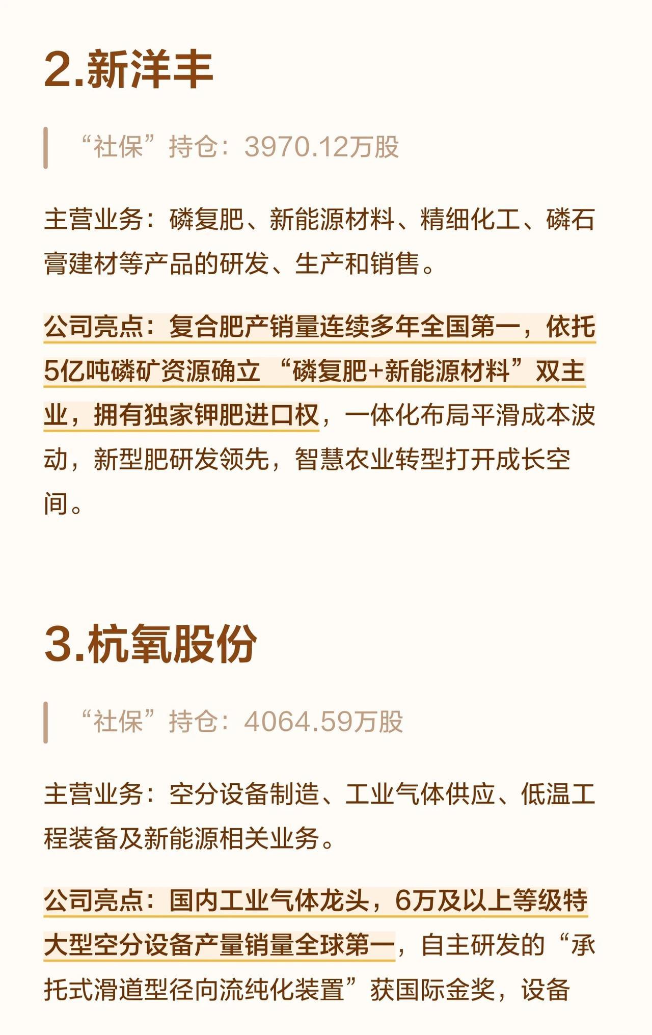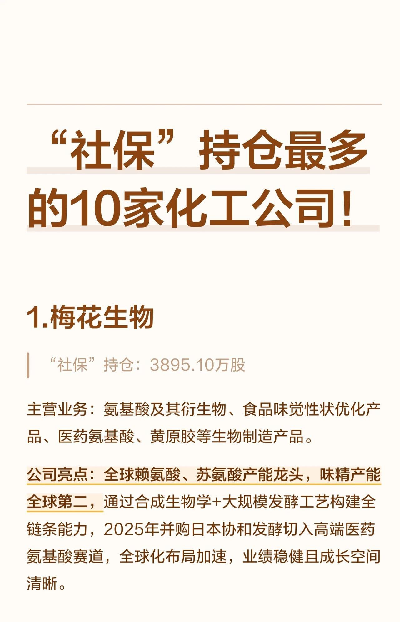 这10家公司均处于各自细分领域的龙头地位,业务涵盖氨基酸、化肥、工业气体、化工新材料、农药中间体等多个方向。社保基金选择它们,主要是看重其规模优势、产业链一体化、成本控制能力以及清晰的成长空间。