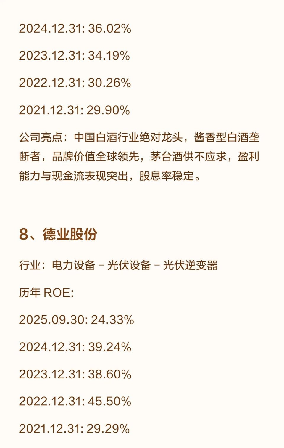 6.贵州茅台:白酒绝对龙头(酱香垄断,品牌全球领先),盈利与现金流突出,股息率稳定,ROE连续五年超24%(2025.09.30为24.64%,近年持续回升)。