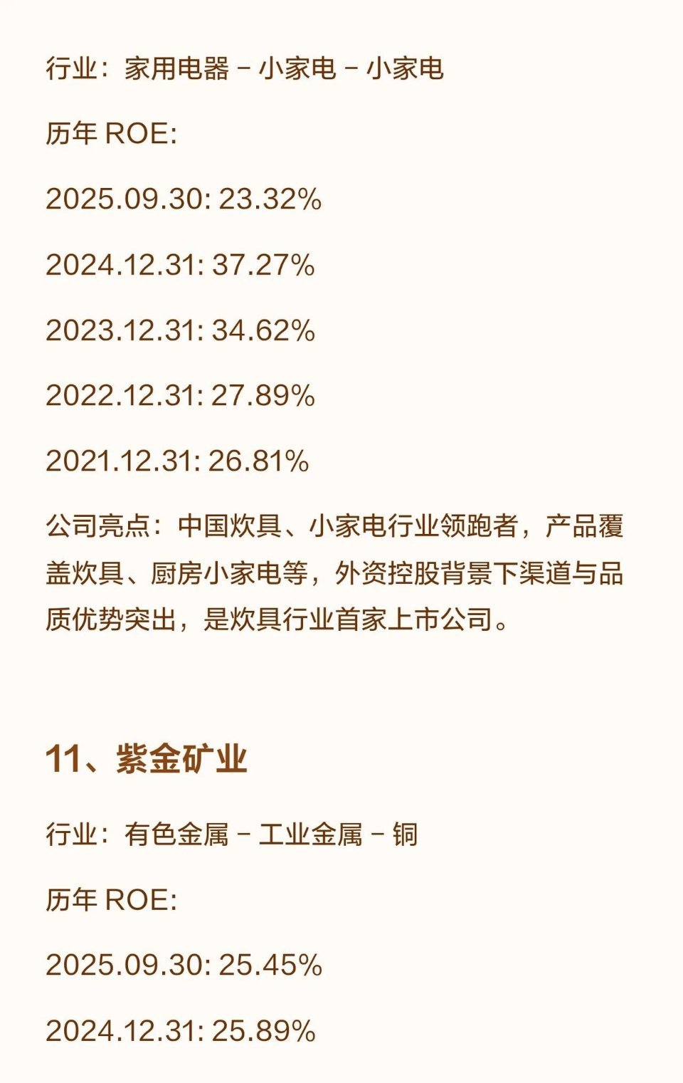 9.苏泊尔:炊具、小家电领跑者,外资控股下渠道与品质优势突出,ROE连续五年超23%(2025.09.30为23.32%)。
