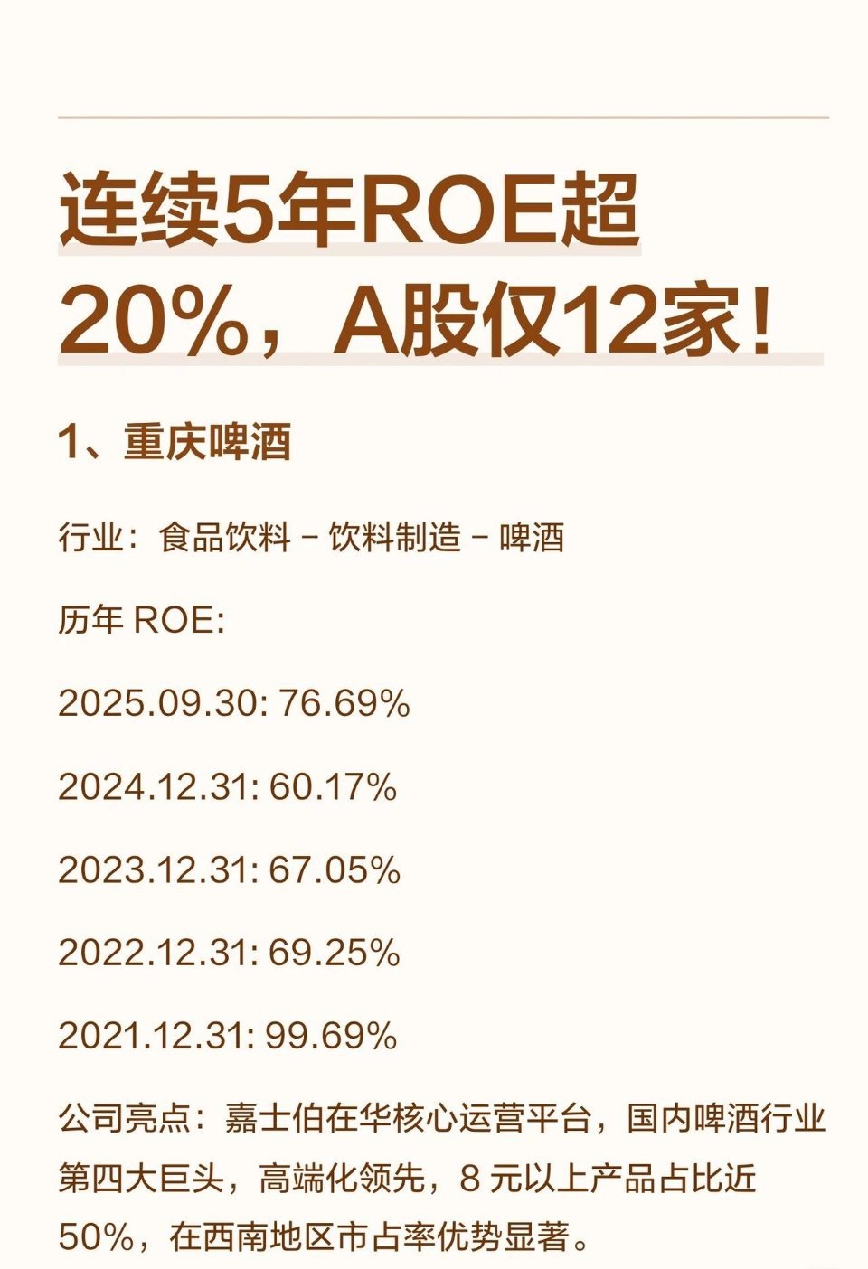1.重庆啤酒:啤酒行业,嘉士伯在华核心平台,高端化领先(8元以上产品占比近50%),西南市占率突出,ROE连续五年超60%(2025.09.30达76.69%)。