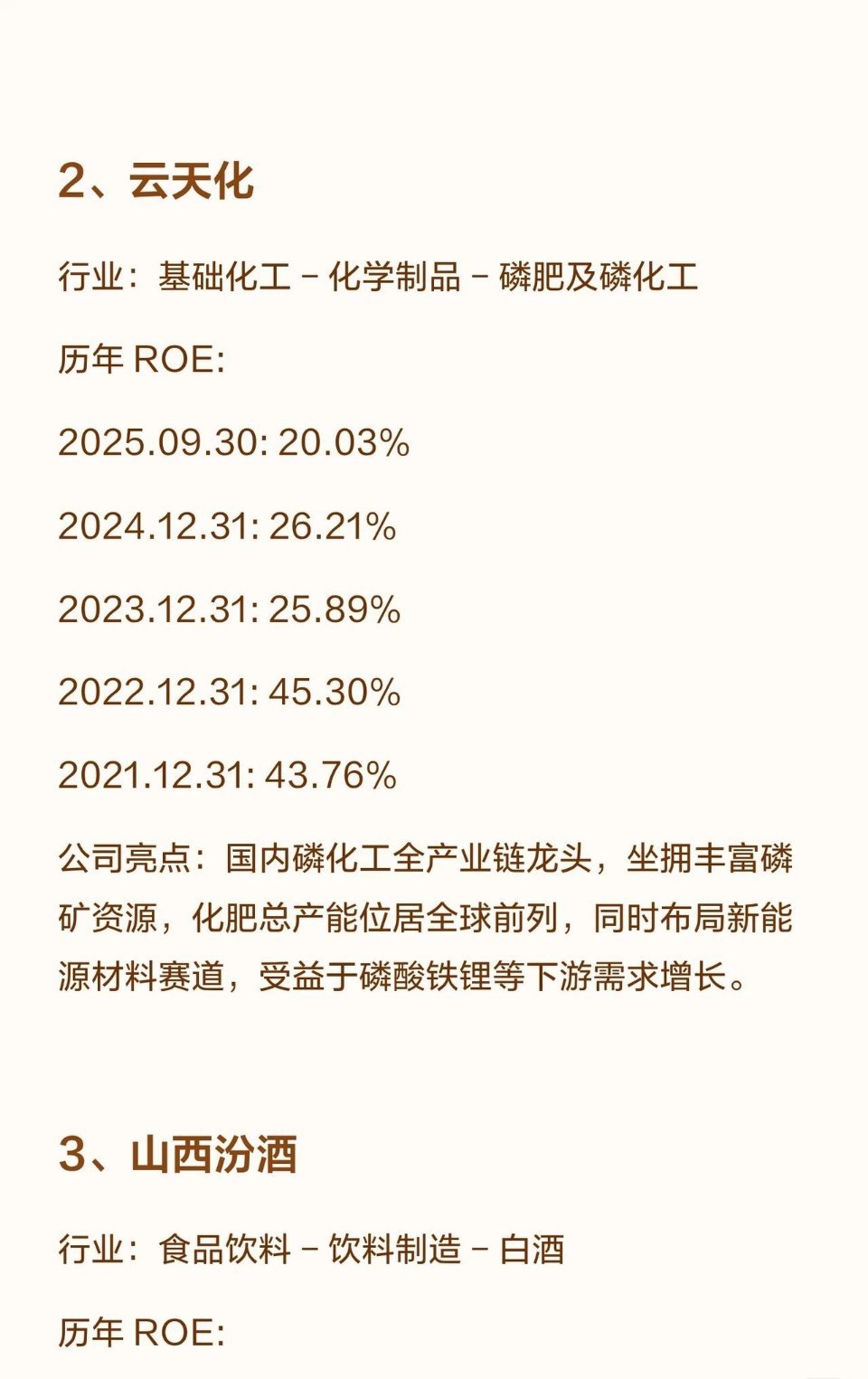 2.汾酒(清香型白酒龙头):青花汾酒带动量价齐升,全国化布局成效显著,营收居白酒三甲,ROE连续五年超39%(2025.09.30为31.82%,略降但保持高位)。