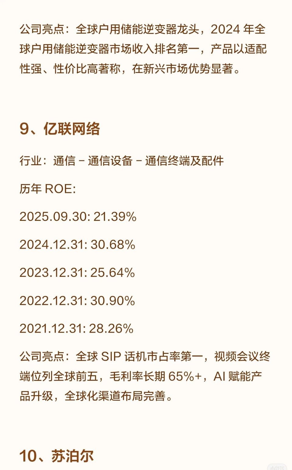 8.亿联网络:全球SIP话机市占率第一,视频会议终端全球前五,毛利率长期65%+,AI赋能+全球化渠道,ROE连续五年超21%(2025.09.30为21.39%)。