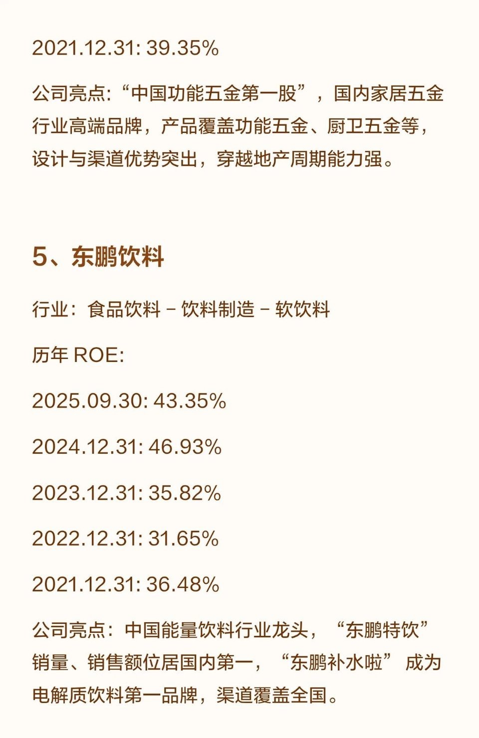4.东鹏饮料:能量饮料龙头(东鹏特饮销量/销售额国内第一,补水啦成电解质饮料第一品牌),渠道覆盖全国,ROE连续五年超31%(2025.09.30为43.35%)。