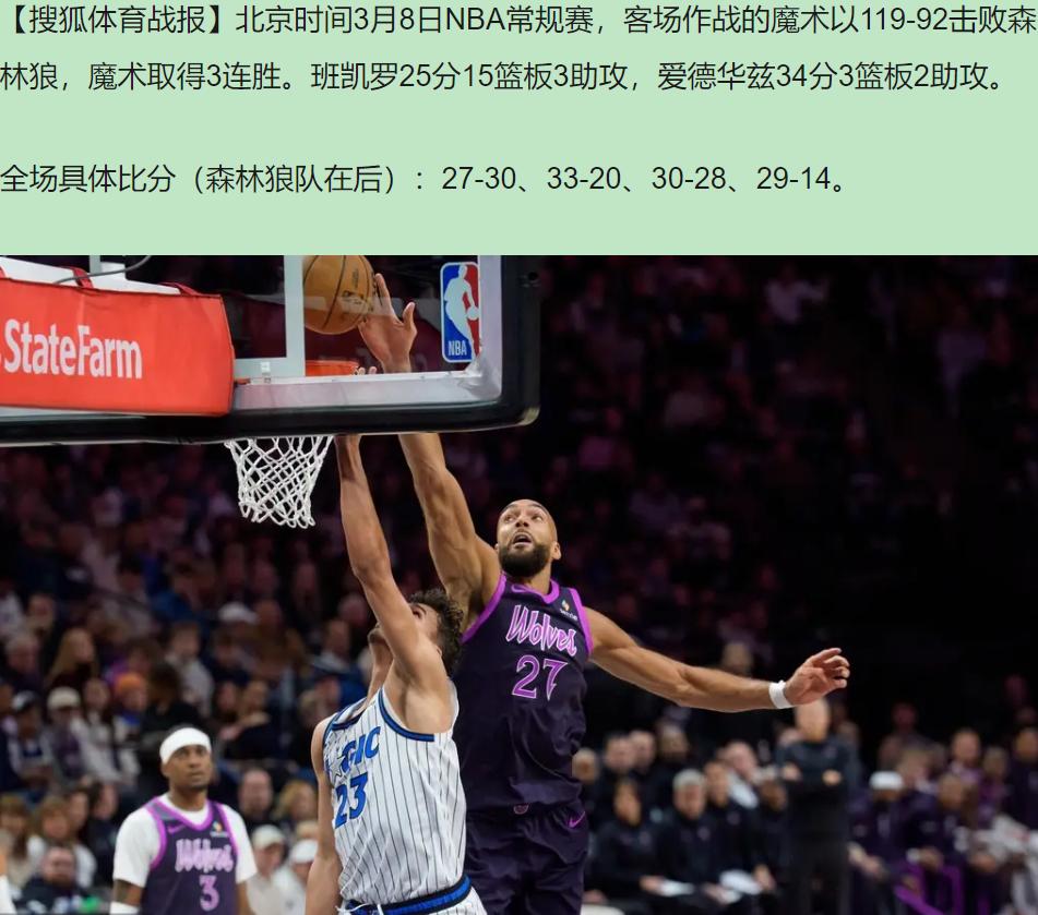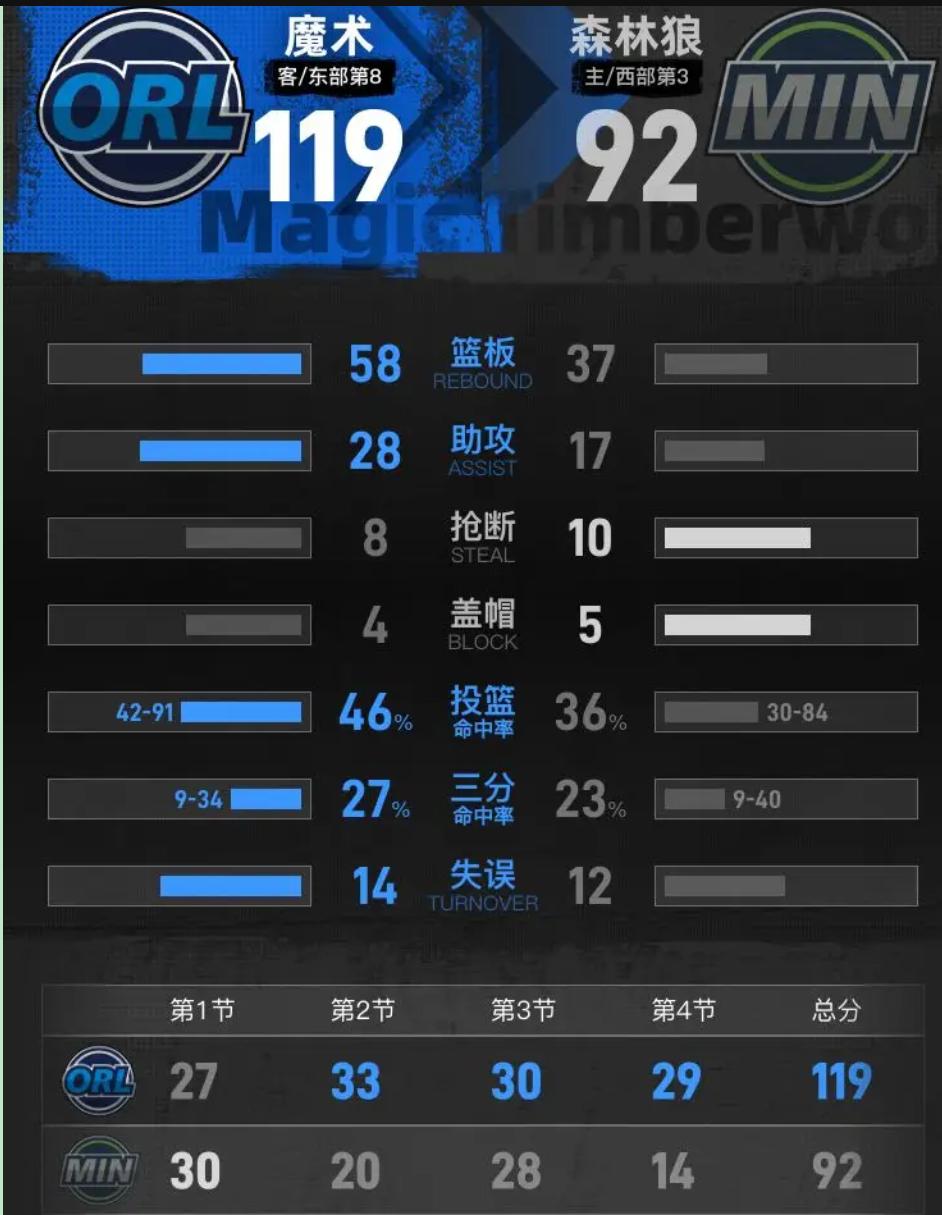 34分,输27分。爱德华兹今晚的数据像一记耳光——扇在所有相信"单核带队"的人脸上。 我坐在屏幕前,看着华子第一节17分手感滚烫,心里却咯噔一下:他三犯了。那种看着核心被迫坐板凳的憋屈,懂球的都懂。上半场只打15分钟,不是体能不够,是犯规管理崩了。你再能硬解,没续航谈什么带队? 说白了,这就是个人英雄主义的黄昏。班凯罗没跟你拼天赋,他就用身体卡住兰德尔的腰眼,25分15板硬生生把"西部第三"吃成了哑巴。兰德尔14中6还有4失误,那种被套缰绳的野马状态,隔着屏幕都替他难受。状元对位,gap就在这了。 更扎心的是角色球员。麦克丹尼尔斯9中0,迪文琴佐2分,戈贝尔12分8板没掀起浪。华子下场时,球队像被拔了氧气管——第二节20分,第四节14分,末节直接断电。反过来魔术呢?贝恩30分 distributed 在关键节段,萨格斯、席尔瓦随时续上火。缺兵少将?他们用团队纪律把坑填平了。 这种反差特治愈我。不是赢球蜜那种爽,是看透了篮球本质的释然。魔术穷啊,伤病潮下凑不齐牌,反而打出了最纯粹的5v5。森林狼坐拥主场五连胜的光环,却暴露了致命软肋:把宝押在一个人身上,队友递不上火柴,明星就成了孤岛。 所以你问我看完想说什么?篮球终究是续航游戏,不是烟花表演。华子的34分很美,但美得孤独。魔术的赢球哲学才真的硬——没有人永远在线,但团队永远有电。这课,狼队学费交得值。华子34分贝恩30分 班凯罗25+15魔术终结森林狼5连胜
