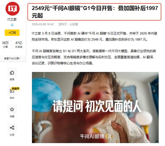 预测一下,接下来AI眼镜行业势必会迎来一场大洗牌! 据IDC统计,2025年智能眼镜全球出货量预计达1452万台,同比增长42.5%。 显然,今年AI眼镜赛道的竞争会越来越激烈,尤其是现在市场又冲出一匹潜力巨大的黑马。没错,就是千问。 3月8日,千问AI眼镜G1正式现货发售,叠加国补后到手价仅1997元起,这款让美媒都直呼“Meta要小心了”的国产AI眼镜杀入市场了。 乍一看,很多人可能会被这个价格所迷惑,能跟Meta正面对垒的高端AI眼镜就这个价?没错 ,价格确实颠覆认知,事实上千问AI眼镜的硬实力才是值得你震撼的地方。 之前千问AI眼镜在MWC 2026展会上可谓是技惊四座,Meta的风头全被抢走了。很多海外观众纷纷排队体验千问AI眼镜,有试戴者直呼“这款眼镜的换电设计太赞了”。 对比Meta的智能眼镜Ran-Ban Gen2,千问AI眼镜的核心配置更加强悍,有专用协处理器、64GB存储、骨传导音频设计,包括配戴舒适性、轻量化,处理的也要更好。 尤其是续航能力,得益于独创的热插拔换电设计,千问AI眼镜能做到全天候续航体验碾压Meta。 让人期待的是,千问AI眼镜还会陆续接入千问APP的“AI办事”能力,诸如点外卖、订酒店、打车等办事能力通通都通过眼镜实现。 在年内,千问AI眼镜还将登陆国际市场,在全球AI眼镜市场展开角逐,这个行业注定要不平静了。