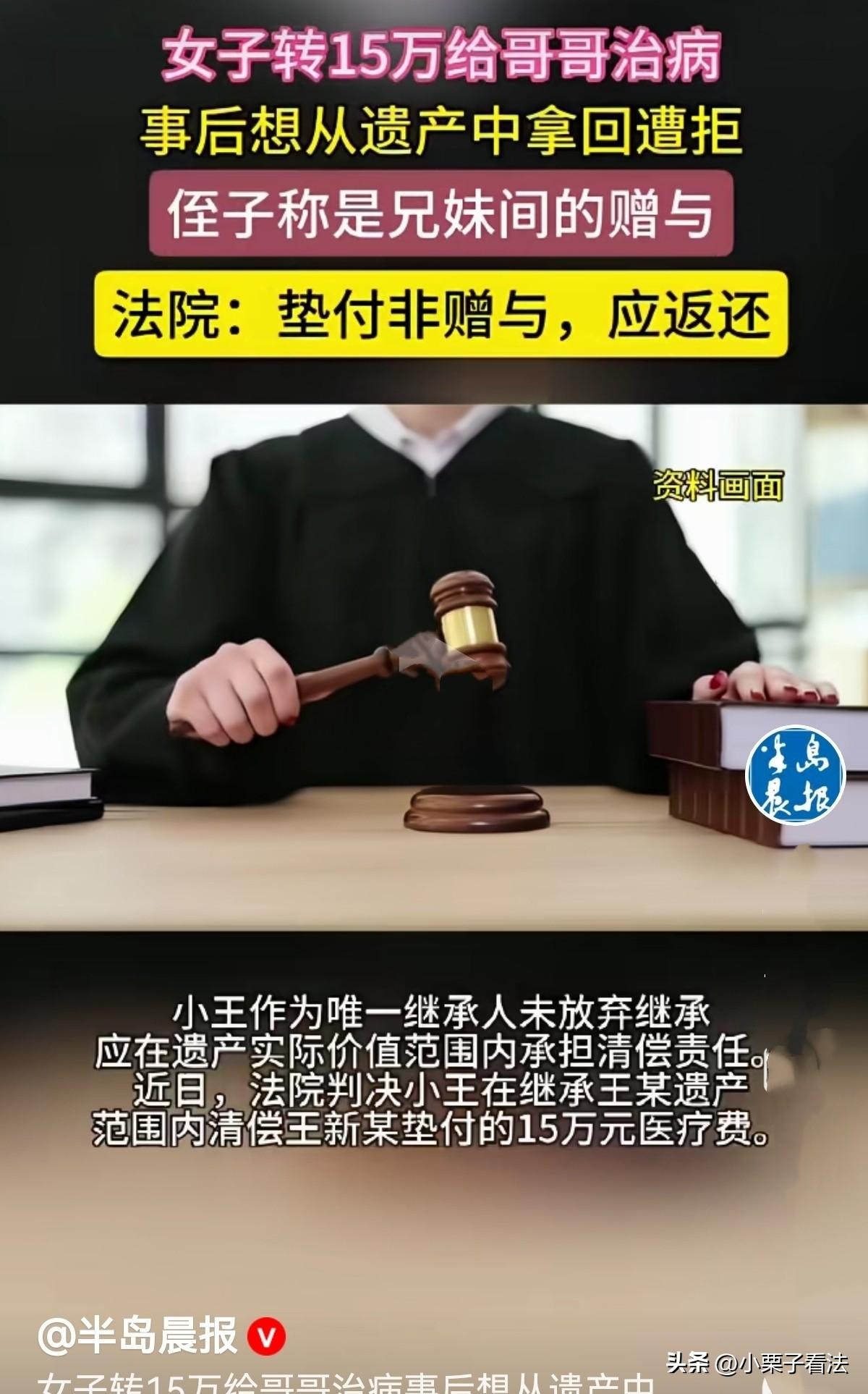 新疆库尔勒,女子哥哥生了重病,她在2个月中转账15万为其支付医疗费,可哥哥还是因病离世。女子向哥哥唯一的儿子索要,让在其父亲遗产中扣除,谁知却遭到侄子的拒绝,他认为那是兄妹间的赠与,是她心甘情愿给的。女子很生气,不再与他纠葛,直接将侄子告上法庭。法院判决出人意料!! 2023年,王女士的哥哥突然病重住院,躺在病床上的人奄奄一息,高昂的医疗费瞬间压垮了这个普通家庭。 看着从小护着自己的哥哥遭此劫难,王女士心里揪得疼,看着家人因医疗费用发愁,王女士没有半分犹豫就开始筹钱。 她拿出自己多年省吃俭用的积蓄,又拉下脸向亲戚朋友东拼西凑,短短两个月里,一笔笔转账接连打给哥哥,前前后后一共15万,全砸在了哥哥的治疗费上。 病床前,看着哥哥满心愧疚的样子,王女士还特意宽慰:兄妹间还客气吗?你安心治病就好。 她怕哥哥有心理负担,从没想过要让这份手足情沾上半点铜臭味,只是单纯想让哥哥能好好接受治疗,哪怕自己背上外债、日子过得紧巴也心甘情愿。 可天不遂人愿,即便王女士拼尽全力,哥哥还是没能熬过这场病痛,在2024年9月不幸离世。 忙前忙后料理完哥哥的后事,看着自己为了治病欠下的一堆外债,还有家里两个孩子的学费、每月要还的房贷,王女士犯了难。 她觉得哥哥去世,他名下的财产变成了遗产,哥哥唯一的儿子会核算遗产,先把账还了,可她没感到侄子有还账的意思。 等来等去她忍不住了,便心平气和地找到侄子小王,希望他能从遗产里把这15万垫付款还给自己。 她本以为,自己出钱是为救他父亲的命,她不需要侄子感恩,但得明白自己的好意。 万没想到,侄子的反应,却让她瞬间如坠冰窟。小王不仅没有半分感激,反倒理直气壮地拒绝。 他还拿出手机里的微信聊天记录,指着王女士说的那句宽慰话,咬定这15万是姑姑自愿的赠与。 “我爸是你亲哥,你给他花钱看病是理所应当,哪有送出去的钱还往回要的道理?” 这话像一把尖刀扎进王女士心里,她又气又委屈,当场红了眼:我是看兄妹情分才垫钱,但垫付不是白给! 我为了给你爸治病,欠了一屁股债,平时零碎开销都没跟你算,只是想要回我垫的治疗费,怎么就成了我不讲理? 她清楚记得,自己曾和嫂子明确说过“你只要把看病报销部分还给我就行了”,这份善意,怎么就被曲解成了理所当然。 亲戚们从中调解,可小王态度强硬,一口咬定是赠与,不肯松口。 王女士心寒到了极点,她看侄子不讲理,也不想与他在纠缠下去,直接将侄子告上了法庭,只求讨一个公道。 法庭上,双方各执一词,争执的焦点就集中在这15万到底是“赠与”还是“垫付”。 小王反复拿着那句暖心话做文章,坚持认为亲情就该无偿付出。 而王女士则拿出了转账流水、医院缴费发票,还有和嫂子的聊天记录,甚至申请了证人出庭,所有人都能证明,这15万是她为哥哥垫付的医疗费,而非无偿赠送。 《民法典》第121条规定: 没有法定的或者约定的义务,为避免他人利益受损失而进行管理的人,有权请求受益人偿还由此支出的必要费用 。 法院审理认为,王女士对哥哥无法定赡养扶养义务,也无约定垫付义务。她垫钱是为救哥哥、避免其利益受损,属于无因管理。 《民法典》第1161条规定: 继承人以所得遗产实际价值为限清偿被继承人依法应当缴纳的税款和债务。 超过遗产实际价值部分,继承人自愿偿还的不在此限。继承人放弃继承的,对被继承人债务可以不负清偿责任。 王女士为哥哥治病支付15万属于遗产债务, 侄子作为继承人未放弃继承,必须在继承遗产的范围内偿还15万。 若遗产不足15万,侄子无需自掏腰包补差额;若遗产多于15万,以15万为限清偿。 最后法院判决:王女士支付的15万为垫付非赠与,小王需在继承父亲遗产的范围内,向王女士清偿这15万元 。 拿到判决书的那一刻,王女士心里五味杂陈,她赢了官司,拿回了属于自己的钱,却输掉了珍贵的亲情。 小王一心想着霸占遗产,却忘了姑姑曾为救父亲倾囊相助,最终不仅没占到便宜,还寒了亲人的心,实在得不偿失。 说到底,钱没了可以再赚,可亲情一旦裂了缝,就再也回不到从前。 法律守住了公平正义的底线,却难抚平人心的褶皱,这起官司也给所有人提了个醒:亲情珍贵,但亲兄弟明算账,别让善意被曲解,别让金钱毁了血脉相连的情分。 对此您怎么看?