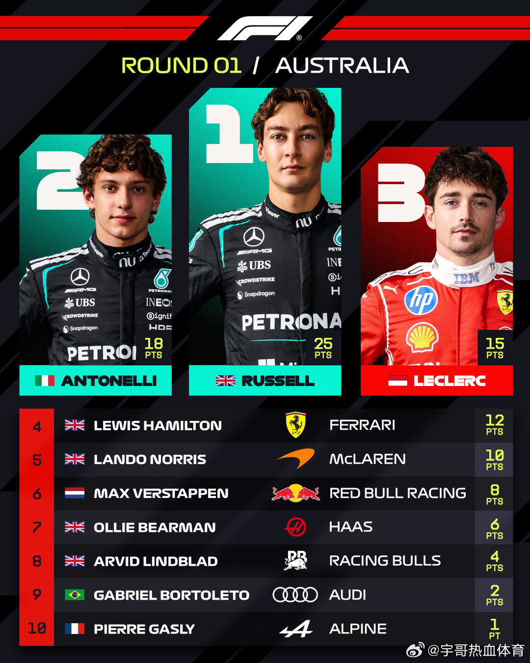F1正赛新规下的F1第一站比赛,混乱又精彩,维斯塔潘从第20名发车,最终排名第6名,了不起的攀升,尽力了。最大赢家是梅赛德斯奔驰。