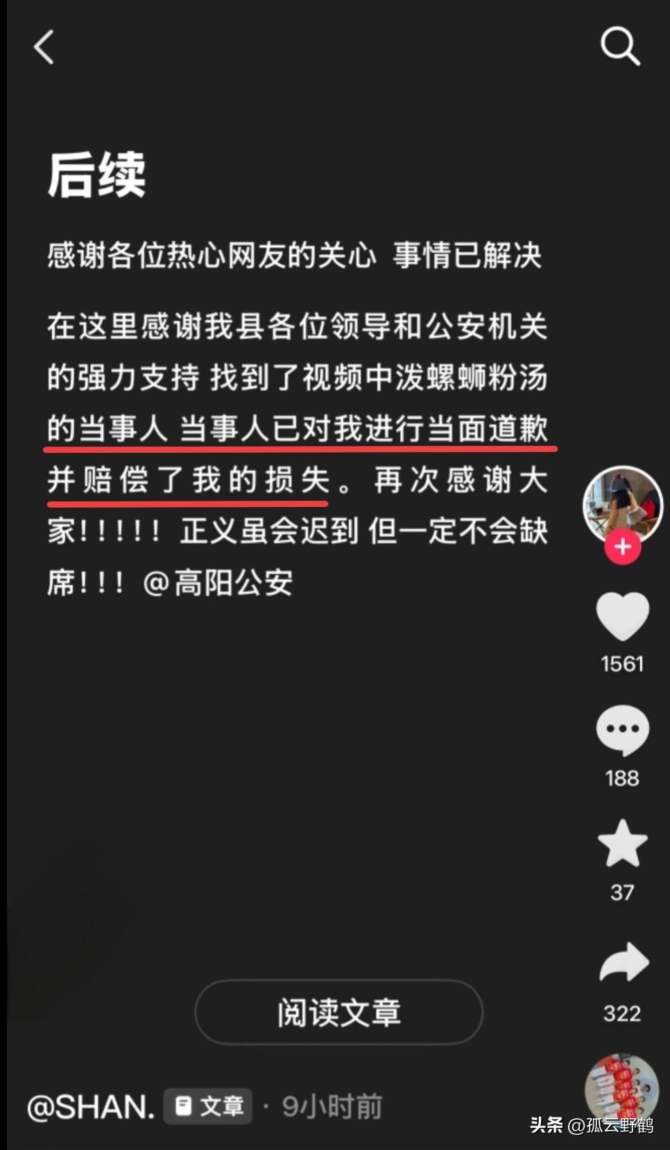 被泼螺蛳粉汤女子账号曝光,发声称此事已经解决,波汤女已向她道歉赔偿 这件事发生在河北保定,一家螺蛳粉店内,因误拿凳子引发的恶意报复事件。 穿粉色羽绒服的女孩怎么也没想到对方会坏到这种程度,仅因为当时拿了对方凳子坐了一下,她都道歉还回去了,为什么还要往她衣帽上泼红油汤。 于是,粉衣女子看完监控后当场气着不轻,将这段监控曝光在网络上,别说女子气愤,就连当时调监控的店员也是一脸不可置信,真没想到还有这样的人。 随着舆论发酵,波汤女已被找到,并没有为自己狡辩什么,我想她也是看到了网络上流传的视频,跟当事人道歉态度也挺诚恳的,并赔偿了羽绒服的损失。 还好,粉色女子并没有过多追究,不然波汤女恐被处罚,希望她经过这次的教训,以后能收敛一点自己的脾气,因为一些口角,就对他人实施恶意,看似“解气”,实则是在给自己的人生挖坑。 毕竟,没人愿意和一个“随时会泼汤”的人做朋友。 大家说对吗?