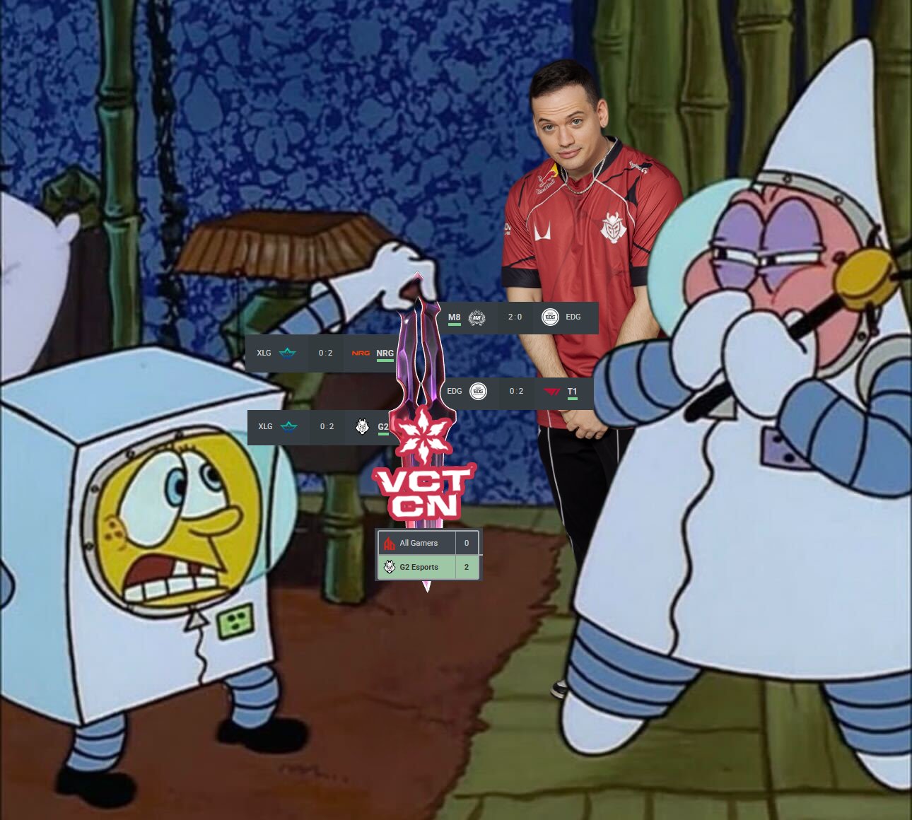 虎扑03月08日讯G2用派大星难绷表情包调侃CN赛区在圣地亚哥大师赛的战绩:
