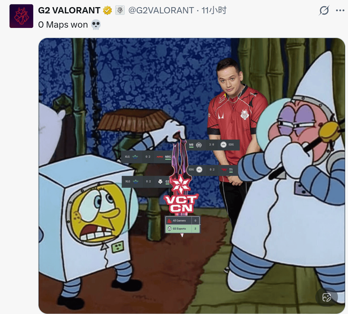 G2用派大星难绷表情包调侃CN赛区战绩:赢了0张图啊