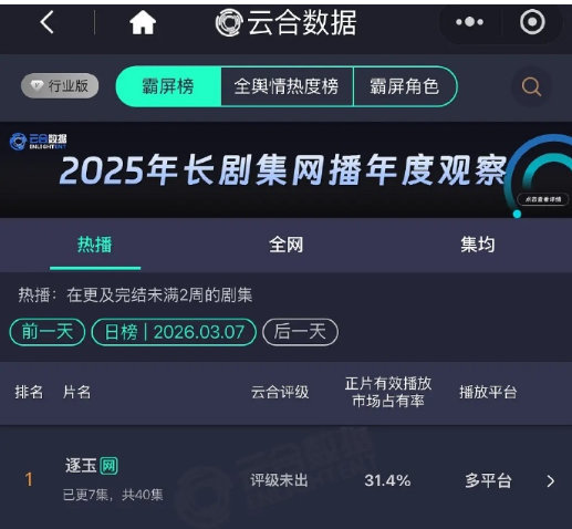 逐玉走势 逐玉走势一跳两三千,云合数据首日市占率16.1%空降榜首,次日暴涨至31.4%,热度一路飙升,咱就说不允许还有人没看我们的小逐玉啊~