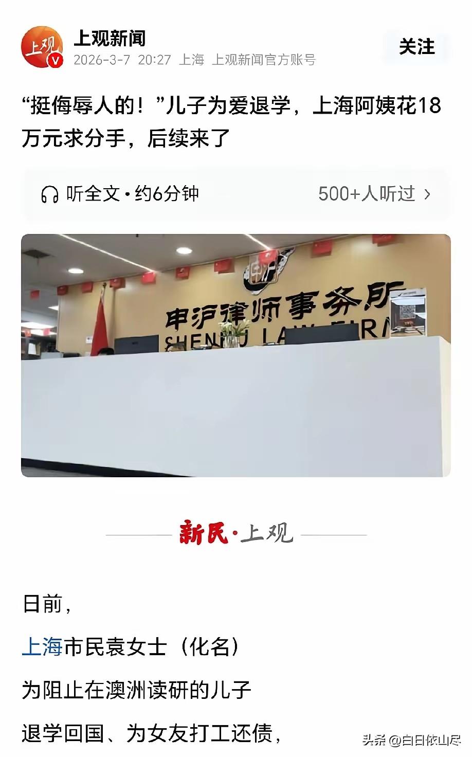 伤害不大,侮辱性极强!上海,留学的儿子向母亲索要30万给女友还债,遭到拒绝后,儿子提出要退学打工帮女友还债。母亲没办法,花18万委托律所让儿子和女友分手并继续留学。可谁知,交完钱第二天,儿子就退学回家,眼看事情没有着落,母亲要求律所退费,结果,律所做法让母亲不能理解。 谁能想到,一心想保住儿子留学学业的上海母亲,掏光18万委托律所帮忙,最后不仅事儿没办成,想要回费用还被百般刁难,甚至被要求签声明、手持身份证录像道歉,这份委屈,换谁都难以接受。 这件事的导火索,还要从这位母亲在国外留学的儿子说起。儿子远在澳洲攻读硕士,本该专心完成学业,却在恋爱后彻底冲昏了头脑。 交往一段时间后,儿子突然联系母亲,开口就要30万,说是要帮女友偿还债务。母亲一听就觉得事有蹊跷,担心儿子遭遇情感骗局,也不愿拿辛苦钱去填未知的窟窿,当即拒绝了儿子的无理要求。 可被爱情蒙蔽的儿子根本听不进劝,被母亲拒绝后,非但没有反思,反而放出狠话,称要直接退学回国,打工赚钱帮女友还债。 这话彻底戳中了母亲的软肋,辛辛苦苦供儿子出国读研,眼看就要学有所成,怎么能因为一段感情毁了前程,心急如焚的母亲,四处寻找解决办法,最终找到了一家律所,希望能帮忙劝说儿子分手,同时保住他的留学学业。 双方沟通后,母亲和律所达成委托协议,支付了18万费用,律所承诺会推进相关工作,促成儿子和女友分手,并且让儿子继续留在澳洲完成学业。满心期待的母亲以为终于能解决心头大患,可万万没想到,交钱后的第二天,噩耗就传来了。 儿子根本没等律所介入,直接自行办理了澳洲的退学手续,收拾行李飞回了上海,回国后更是直接搬去和女友同住,彻底断了留学的念头。 母亲得知后崩溃不已,带着律所律师赶到机场接机,试图让律师劝说儿子回心转意,可儿子全程态度冷淡,对律师和家人的劝说置之不理,律所承诺的两大核心目标,还没正式开展就彻底落空。 事已至此,母亲觉得律所没能提供有效服务,根本没完成委托事项,便向律所提出退费要求。可律所的回应,让母亲彻底寒了心。 律所先是拿出合同,称母亲属于单方面违约,费用一概不退,甚至还表示没追究她的违约金,已经是格外留情。多次协商后,律所态度依旧强硬,起初只愿意退还一小部分费用,还声称要按照每小时数千元的工时费扣除服务费。 母亲无法接受这样的结果,明明律所没做多少实质性工作,只是参与了一次机场接机、做过简单沟通、调取过少量信息,就要扣掉大半费用,实在不合理。随后,在相关部门的介入调解下,双方坐到一起协商,可律所又提出了更过分的要求。 律所表示,可以退还九成费用,但前提是母亲必须签署一份声明函,承认自己此前的言论损害了律所的声誉,还要手持身份证,对着镜头念出声明内容并录像。 这样的要求,在母亲看来就是极大的侮辱,自己只是合理要求退费,陈述的都是事实,从未刻意诋毁律所,凭什么要低头认错,像犯错一样录视频道歉。 好在相关监管部门及时介入,明确指出律所要求签署声明、手持身份证录像的做法十分不妥,当场制止了律所的无理要求,责令其整改。 在监管压力和舆论关注下,律所最终转变态度,主动和母亲协商解除合约,将18万费用全额退还给了她,这场闹得人身心俱疲的纠纷,才终于落下帷幕。 从爱子心切花重金托人办事,到事没办成退费遭刁难,这位母亲的遭遇让人唏嘘,而律所前期承诺与后续服务的反差,以及退费过程中的无理要求,也让人倍感无奈。 对此,你们有什么看法,欢迎评论留言~