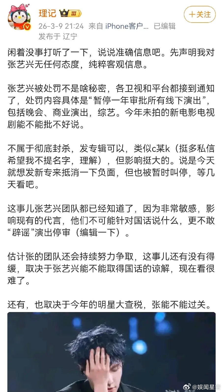 理记居然点名 张艺兴他爆料 被罚了 不是很严重的那种,可以发专辑,但是 晚会,商业演出,综艺都没他什么事了,和C差不多,只不过他是暂时的。张艺兴前脚刚发律师函,后脚他就来锤,这是真不怕被告,还是自信自己说的是真的。看张艺兴接下来有没有主流活动就知道真假了,他本人没问题。