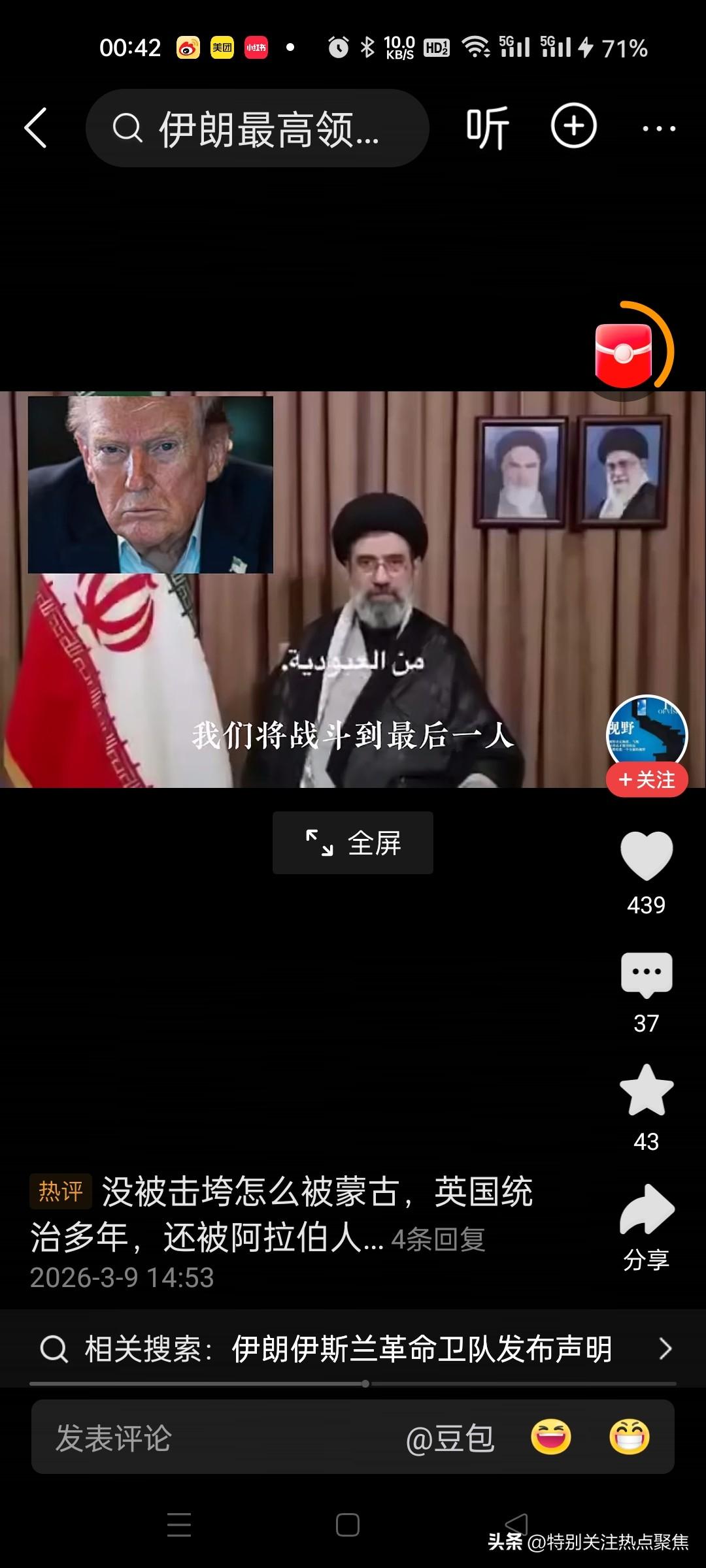 炮弹比贺电来得还快,传伊朗新任最高领袖穆杰塔巴·哈梅内伊“就任后14分钟遭袭击” 就任14分被炸伤 关于伊朗新任最高领袖穆杰塔巴·哈梅内伊“就任后14分钟遭袭击”的说法,目前没有官方权威信息证实。根据现有公开报道,关于他受伤的情况主要存在以下两种说法: 1. 官方承认“受伤”,但未提及“14分钟” 伊朗国家电视台在报道穆杰塔巴就任时,确实承认他在“斋月战争”(当前冲突)中被敌人击伤,并称其为“janbaz”(意为“受伤的战士”)。 * 关键点:官方报道并未提及“就任后14分钟”这一具体时间点,也未说明伤势的严重程度或具体部位。 2. 更早的“空袭受伤”说 另一种主流说法是,穆杰塔巴的伤情源于2月28日美以对伊朗的空袭。在那次袭击中,他的父亲(前最高领袖哈梅内伊)、妻子、母亲及多名亲属遇难,而他本人幸存但受伤。这一说法认为,他是在受伤状态下被推举为最高领袖的。 3. 关于“14分钟”的推测 “14分钟”的说法可能源于对专家会议(选举机构)遭遇袭击时间的误读。有报道称,专家会议在选举新领袖期间,其秘书处办公地点曾遭到轰炸,导致数名工作人员遇难。这一事件可能被误传为领袖本人就任后立即遇袭。 总结:穆杰塔巴确实受伤,但并非发生在就任后的14分钟,而是更早的军事行动中。目前他尚未公开露面,健康状况成谜。