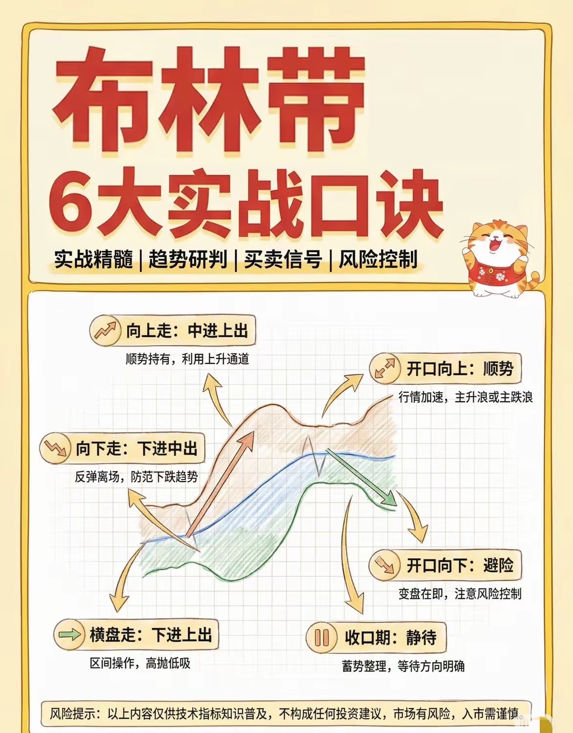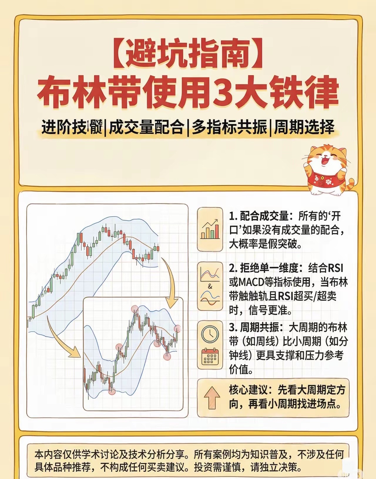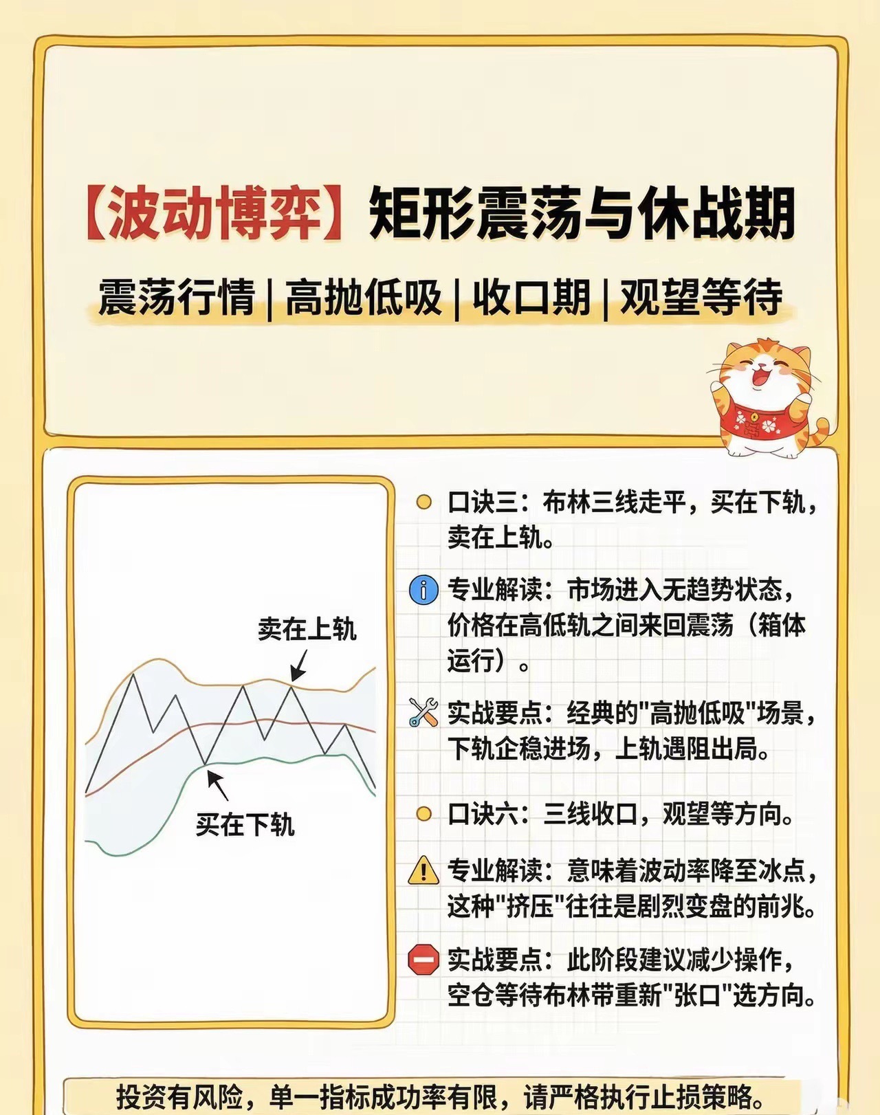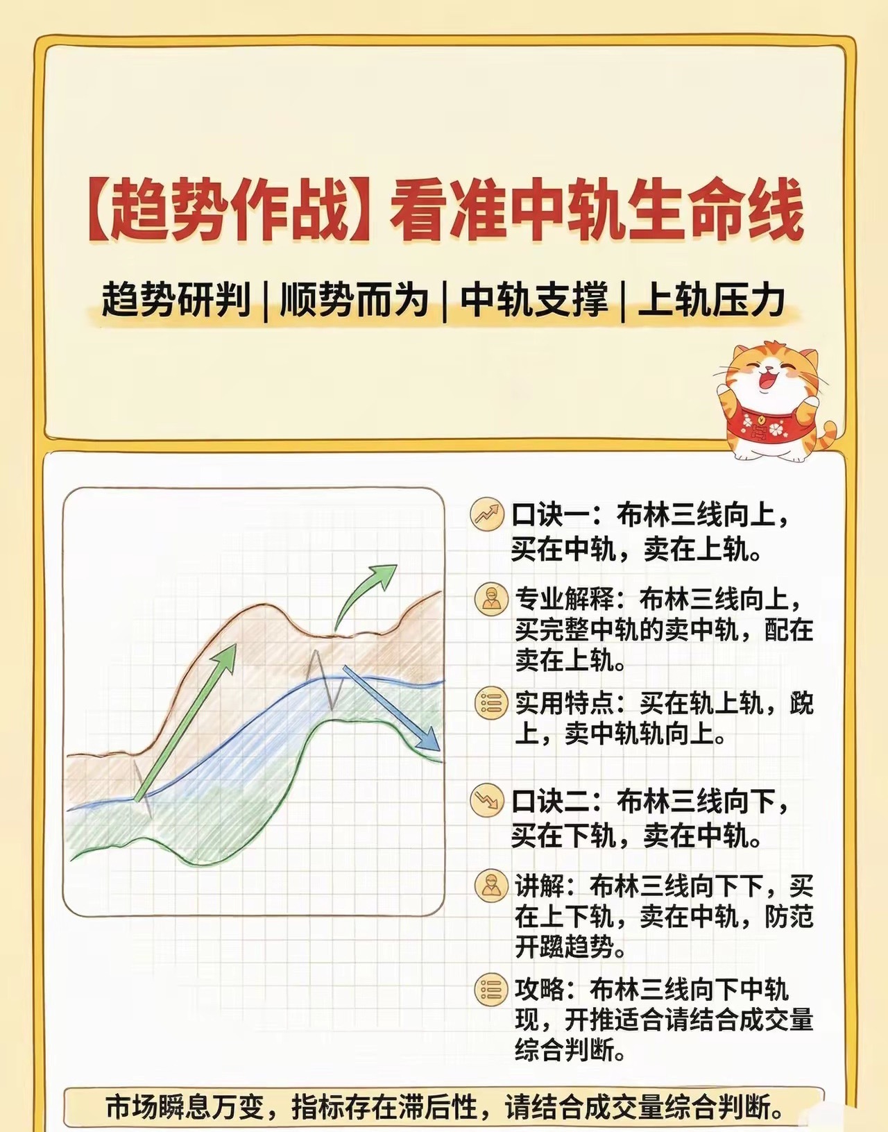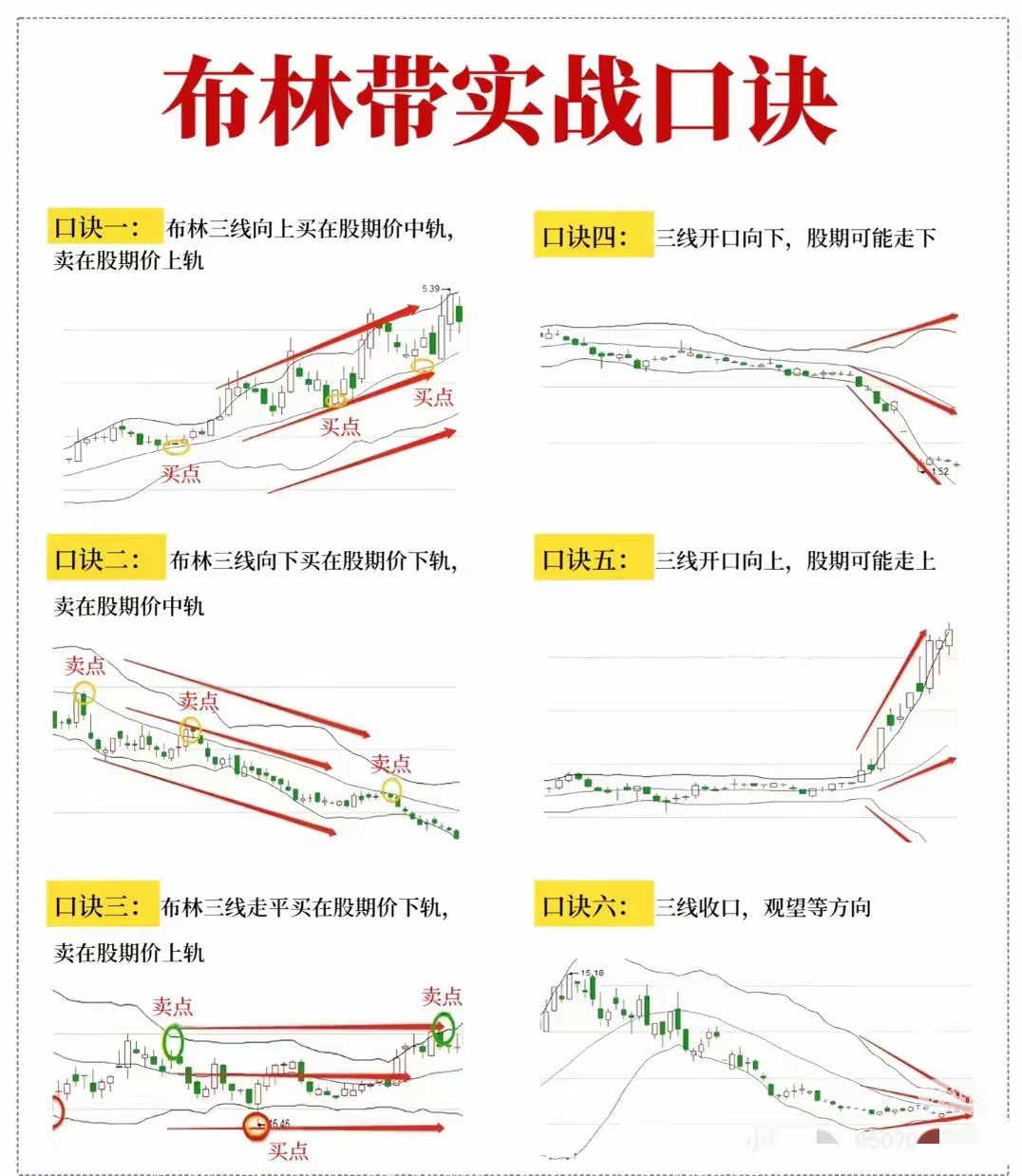 看懂布林带基本参数,掌握财富密码布林带(BOLL)是股民必备的趋势指标,由约翰·布林格发明,由上轨、中轨、下轨三条线组成,新手也能快速上手。中轨默认是20日均线,代表中期趋势;上轨是中轨+2倍标准差,为压力位;下轨是中轨-2倍标准差,为支撑位。轨道会随股价波动自动宽窄,波动大则开口扩大,横盘则收口变窄。实战用法很直接:股价在中轨上方为多头,回踩中轨是低吸机会;在中轨下方为空头,反弹中轨宜减仓。震荡市触及下轨可低吸、触碰上轨可高抛;轨道收口后放量突破上轨,往往是上涨信号,跌破下轨则警惕下跌。新手记住口诀:中轨定多空,上下轨看买卖,收口等突破,开口顺趋势。搭配成交量、MACD过滤假突破,胜率更高。不用复杂公式,看懂三轨,就能轻松判断支撑、压力与趋势转折。
