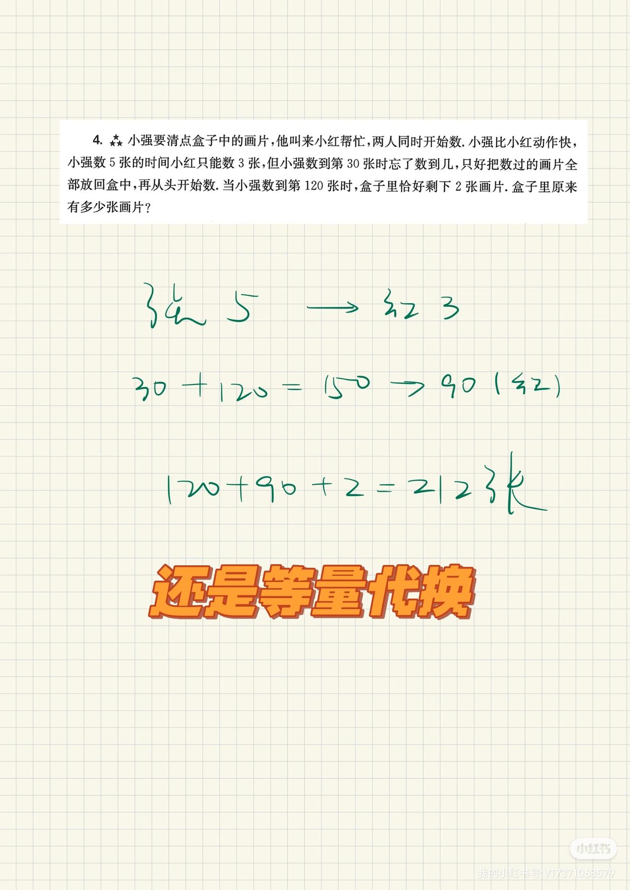 三年级导引第2讲,第2讲超越篇的难度并不是很大,除了最后两道题有一点绕之外,前面的难度要比第1讲稍微低一点。 虽然题目不难,但是考察的知识点,或者说需要学生掌握的知识点还是很重要的,那就是等量代换的思想,实际上是给五年级方程求解应用题做一些前期的铺垫。
