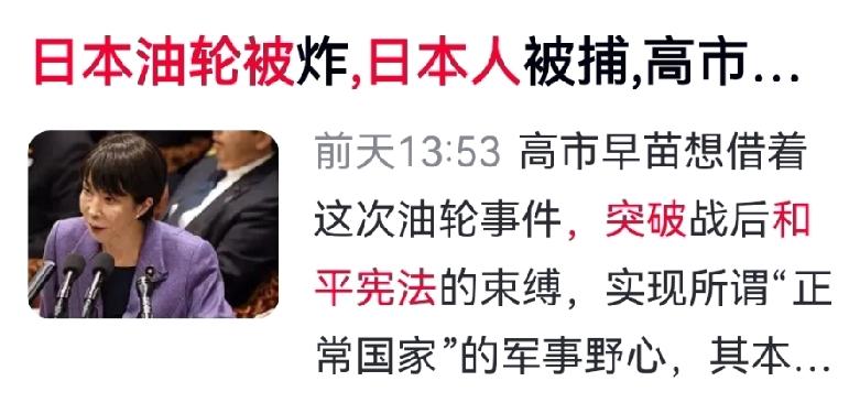 玩火自焚!日本油轮被扣,妄想借事故突破和平宪法 日本油轮在中东连人带船被扣,举国关注,日本政府却反常地“暗喜”。美以空袭、伊朗封锁霍尔木兹海峡,日本95%能源命脉捏在别人手里,这船油本是救命粮,如今却成了死结。 更讽刺的是,被扣的NHK社长涉嫌为美搜集情报,日方刻意噤声。伊朗早已看穿日本两面三刀的把戏,扣船扣人,严厉警告。 高市早苗政府正愁没借口修宪扩军,这下竟把危机当成“天赐良机”,试图以护油为名,派自卫队挺进中东,企图突破和平宪法束缚。 殊不知,霍尔木兹海峡尽在伊朗掌控之中。日本主动入局,想当霸权附庸,最终极可能搬起石头砸自己的脚,不仅救不回油,反而会彻底断送本国的能源安全。 对此,你怎么看? 日本 中东局势 霍尔木兹海峡 国际热点