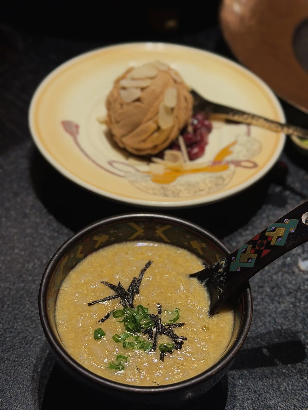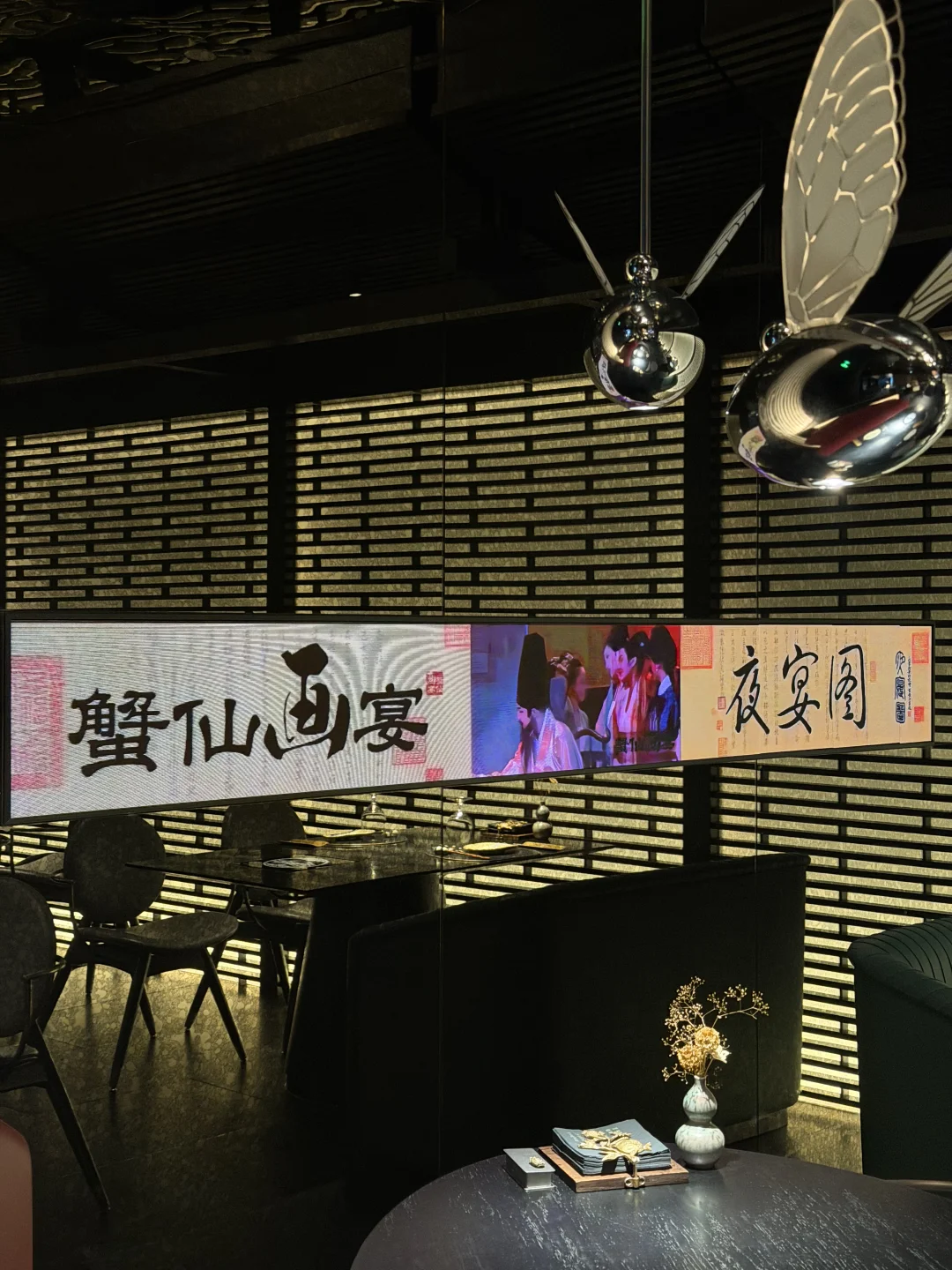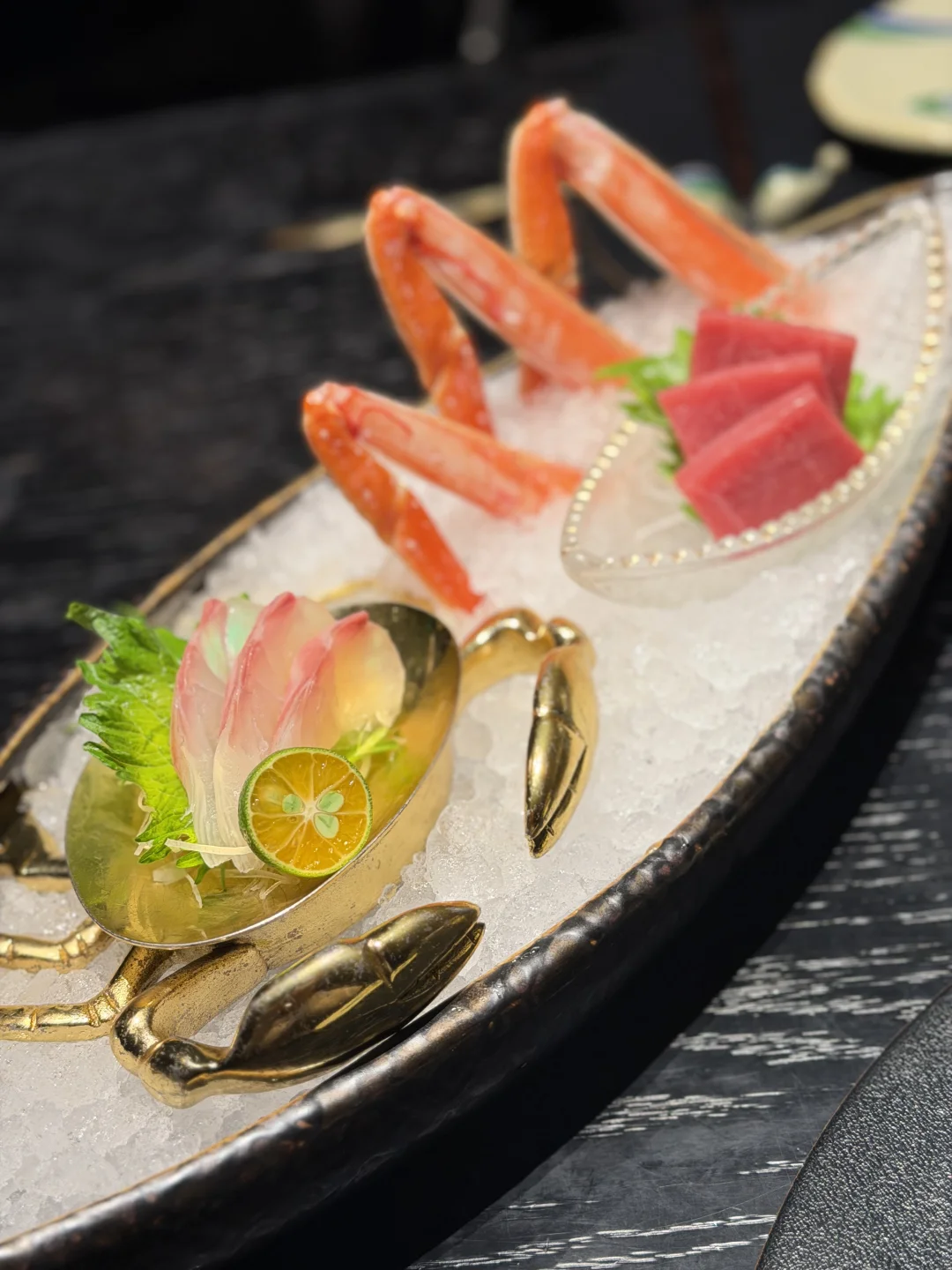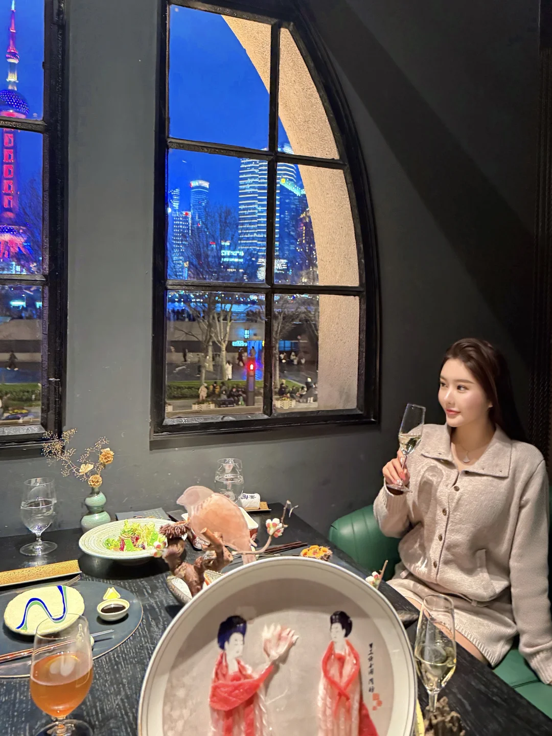 环境很安静 背靠外滩陆家嘴 整体偏黑金暗系风格 靠窗刚好可以看到东方明珠 一曲舞蹈表演和名画菜品的结合 海胆鲜甜 簪花仕女图刺身别致又好味 蟹黄泡饭粒粒分明 蒸蛋会更浓郁点 饭后冰激凌nice的 临走还送了金箔画和包包💕