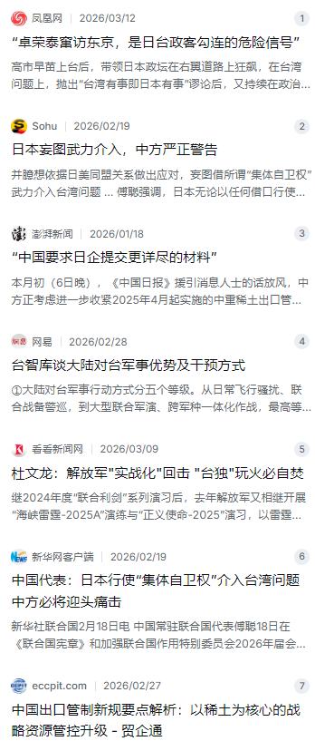 中方彻底封锁台海干预通道:联合国公开警告日本,出口管控+东风导弹齐发,中国底线不可挑战! 麻烦看官老爷们右上角点击一下“关注”,既方便您进行讨论和分享,又能给您带来更多优质的内容,感谢您的支持! 最近这段时间,台海这边的动静确实不小,但明眼人都能看出来,这根“导火索”压根不在咱们这边。事情的起因是日本政客又在那儿炒作老掉牙的“台湾有事就是日本有事”这套谬论,甚至还有日本右翼势力借着体育交流的名义,偷偷摸摸跟台湾地区的某些人搞政治勾连。就在前几天,还曝出台行政机构负责人跑到东京去,搞什么所谓的“私人交流”,这哪是什么看球啊,分明是披着羊皮的政治闹剧,直接打破了中日建交几十年来的惯例 。 面对这种蹬鼻子上脸的挑衅,咱们这回的反应那是相当干脆利落,直接在国际场合把话撂明了。咱们的常驻联合国代表傅聪大使,在纽约联合国总部的一场会议上,当着全世界的面点了日本的名。话说得特别重,直接警告日本,要是敢拿那个什么“集体自卫权”当幌子,真刀真枪地介入台湾问题,那性质就变了,那就是对中国的侵略,咱们解放军肯定迎头痛击,说到做到 。这话可不是随便说说,在外交辞令里,这已经是顶格的警告了。 光动嘴皮子当然不够,手里没点真家伙,人家可能还真当你是吓唬人。所以咱们在经济层面也出了实招,而且这一招直接打在了日本的七寸上。大家都知道,日本那些高科技玩意儿,从电动汽车到半导体,都离不开稀土这种“工业维生素”。巧了,全球绝大部分稀土的加工和供应,咱们说了算 。最近商务部那边动作挺多,把出口管制的口子收得更紧了,不光是稀土成品,连带着生产设备、技术都纳入了管控范围 。 现在的情况是,日本的商界已经开始感受到压力了。有消息说,咱们这边的国企在跟日本企业签新合同的时候,审核严多了,要填的材料堆得老高,得说清楚这稀土到底卖给谁、最后做成了啥、会不会再倒手到别的地方 。有日本的经济研究所算了笔账,这么搞下去,要是管制持续个一年,日本的经济损失搞不好得奔着好几万亿日元去。这不,急得日本连深海钻探船都派出去,满世界找矿去了,想摆脱对咱们的依赖 。但这哪是一天两天能办成的事? 当然,外交上骂回去了,经济上也捏住痛处了,但真正让那帮人夜里睡不着的,还得是咱解放军的硬实力。现在的台海周边,解放军的巡航早就常态化了,不是那种飞过去打个卡就走,而是实打实的战备警巡,用军事专家的话说,这叫“温水煮青蛙”,一点点把他们的活动空间给挤没了 。更让某些人肝颤的是咱们的火箭军,那一个个东风快递,可不是吃素的。根据外媒引用美国国防部的报告分析,咱们手里攥着上千枚中短程导弹,专门就是干这个用的 。 这就得说说咱们这套“反介入/区域拒止”的体系了。简单来讲,就是在咱家门口这片地方,不管你是多牛的航母战斗群,还是多先进的空军基地,真要敢来惹事,咱就有能力让你有来无回。像东风-21D和东风-26这些家伙,一个外号叫“航母杀手”,另一个叫“关岛快递”,射程能打出好几千公里 。有法国媒体都替美军操心,算了笔账:光是美军在冲绳嘉手纳基地那几十架F-35隐身战机,加上跑道、油库那些设施,总价值轻松超过40亿美元,在东风导弹的饱和打击下,撑不了几分钟就得打水漂 。 把这些事儿串起来看,逻辑就特别清晰了。日本那边之所以敢在台湾问题上越跳越高,除了国内右翼势力抬头,想借机军事松绑之外,很大程度上是觉得背后有美国撑腰 。但他们可能没算明白,真到了刺刀见红的时候,美国航母敢不敢往咱们的导弹雨里冲是个巨大的问号。而咱们现在做的,就是把所有的底牌都摊在桌面上:在联合国拍桌子警告,是在法律和道义上堵死你的借口;在稀土上卡脖子,是让你明白干涉别国内政是要付出经济代价的;在台海周边秀肌肉,是让你知道这儿到底谁说了算 。 这一套组合拳打下来,核心目的就一个——设立“护栏”,划定红线。咱们不是要惹事,但绝对不怕事。现在的局势很明白,台湾问题就是中国的内政,没有任何妥协的空间。通过这些实实在在的动作,就是要让东京和华盛顿的那些决策者们清醒清醒,别想着靠臆想和误判来搞什么冒险。总之一句话,中国政府在维护国家主权和领土完整这件事上,那绝对是认真的,底线不容试探,更不容挑战。