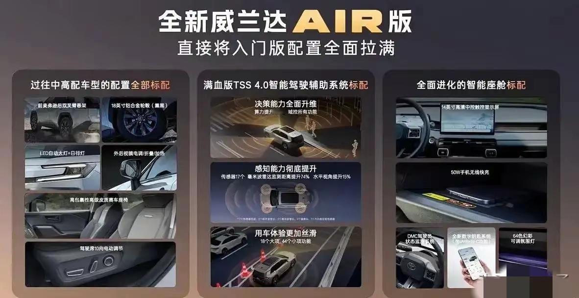 威兰达AIR版新车,它不是在某一个维度上突破,而是在所有维度上重新定义了入门的标准,卓越品质和贴心服务,入门即高配,成为消费者心中中型SUV的更好选择, 广汽丰田威兰达AIR权益价13.78万元,它的优越性不仅体現在这价格上,更打破了“低价=低配”惯例,实現了配置,服务和质保的全面升级,威兰达AIR好车值得拥有,买它不后悔!
