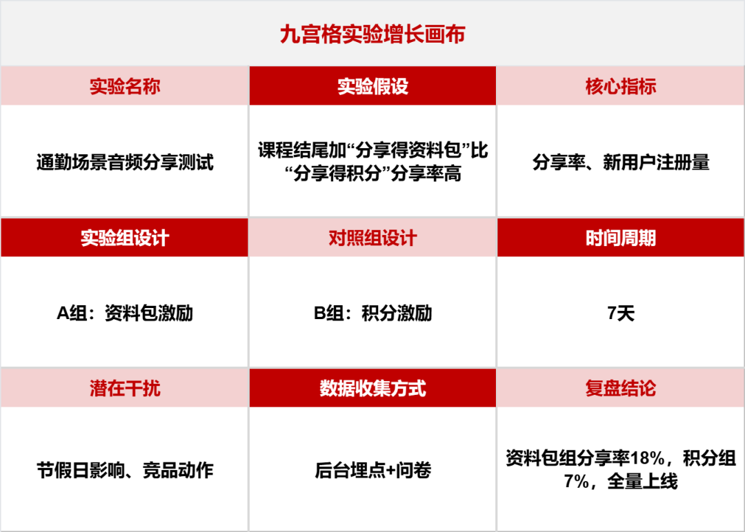 设计九宫格增长实验画布(以在线教育类公司为例),如下所示直接呈现: