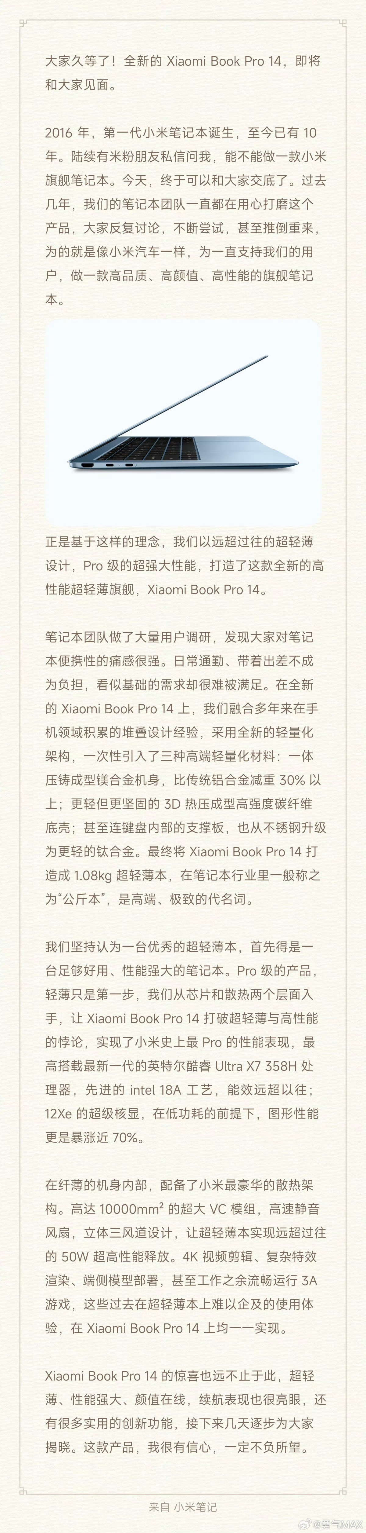 卢伟冰官宣小米笔记本新品即将发布 时隔四年,小米笔记本正式回归,这次直接瞄准超高端公斤本市场,对标XPS、Thinkbook X1 Carbon等旗舰,双品牌布局也更清晰,小米冲高端、Redmi守主流。说实话公斤本全靠定制开模,还要用高端材质减重,成本本就不低,再加上今年硬件涨价,这款新品顶配预计1.2万起,即便叠加国补也会过万。据说小米这款高端笔电,搭载的三代酷睿Ultra,性能提升明显,核显能接近3050Ti,轻薄本也能跑3A,最惊喜的是外观,经典鹅卵石轻薄设计,简洁高级质感拉满,用MacBook Air的颜值,做到接近Pro的性能,期待一波!