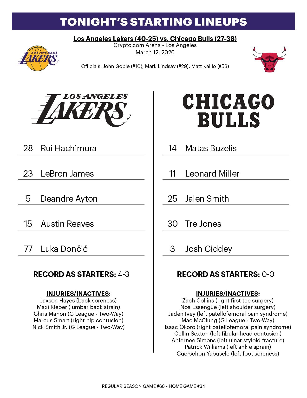 湖人首发:东契奇、里夫斯、八村塁、詹姆斯、艾顿公牛首发:吉迪、琼斯、米勒、布泽利