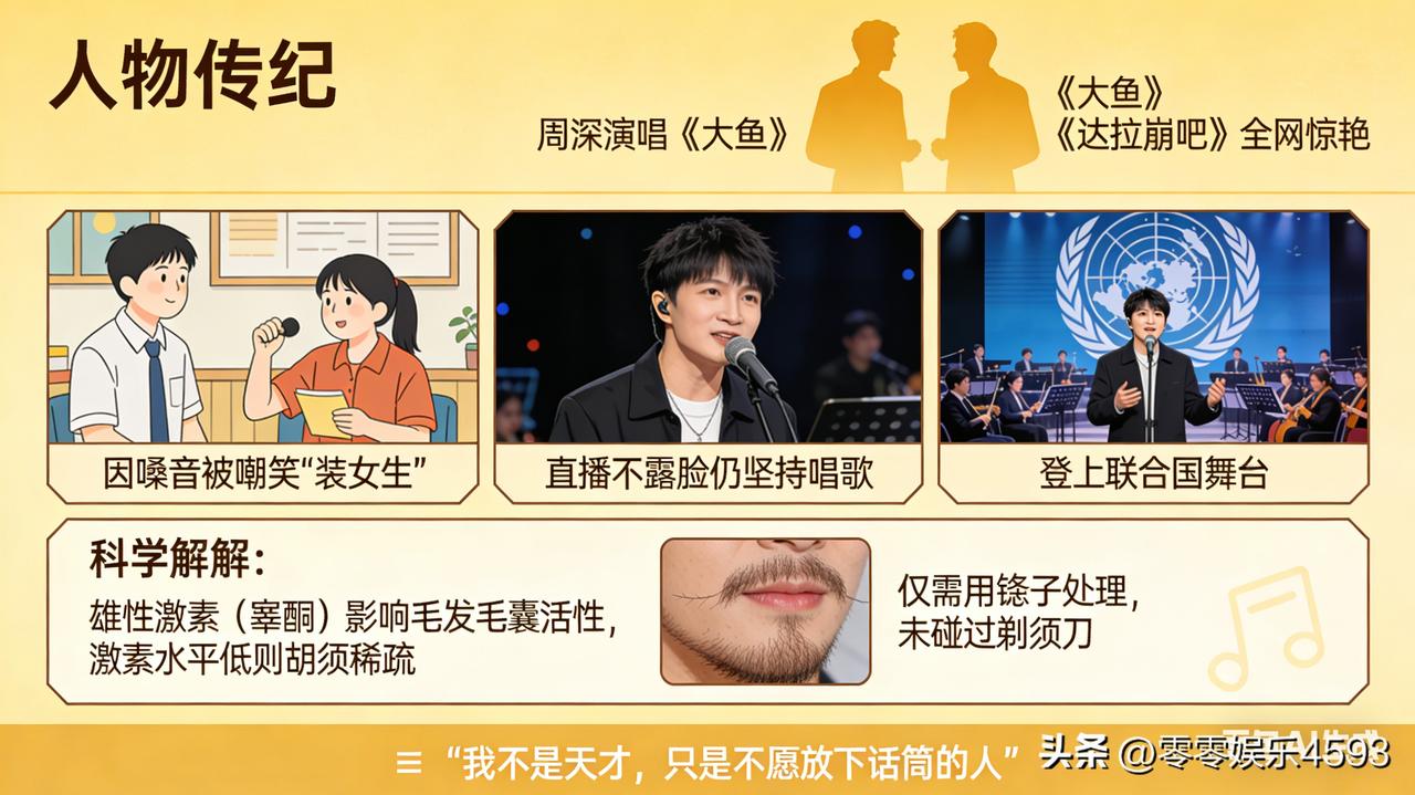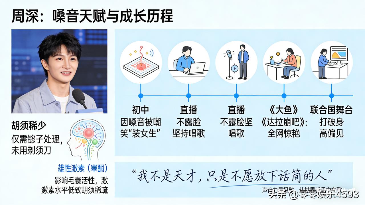 周深在采访中透露,自己胡须稀少到仅需用镊子处理,连剃须刀都从未碰过。这背后或许藏着他嗓音天赋的秘密 —— 生物学上,雄性激素(睾酮)影响毛发毛囊活性,激素水平相对较低时,胡须易生长缓慢且稀疏。而周深的嗓音天生空灵清澈,这种独特嗓音与内分泌调理密切相关。 从初中因嗓音被嘲笑 “装女生”,到直播不露脸仍坚持唱歌,再到《大鱼》《达拉崩吧》让全网惊艳,他用实力打破偏见。即便曾因身高被质疑 “没有冠军相”,但独特的嗓音让他从 “不被看好” 到登上联合国舞台。正如他所说:“我不是天才,只是不愿放下话筒的人。” 连胡须都省事儿的他,却把声音的力量做到了极致,让世界听见中文歌的魅力。